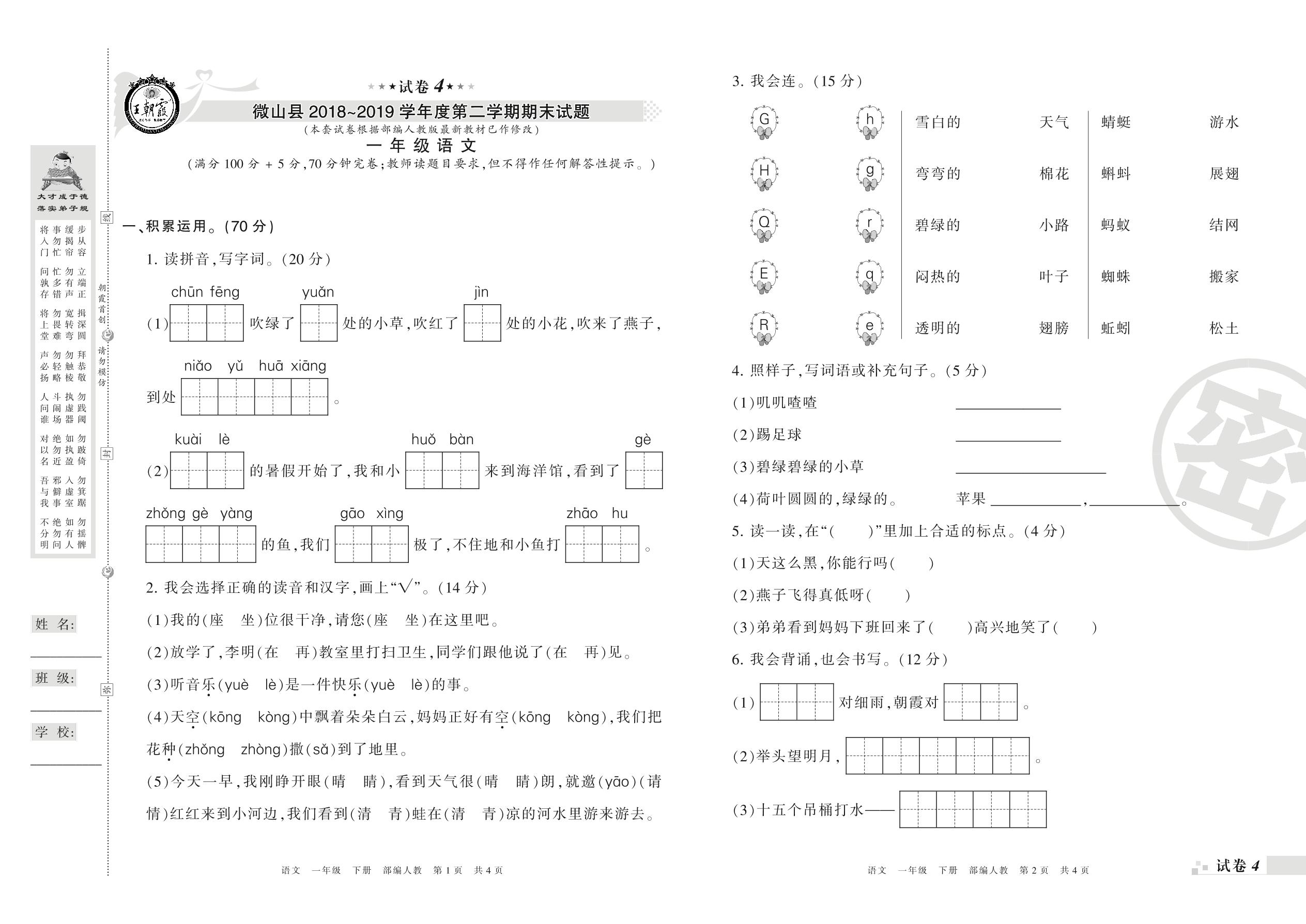 2018-2019学年第二学期济宁市微山县一年级语文试卷(人教版)【4】