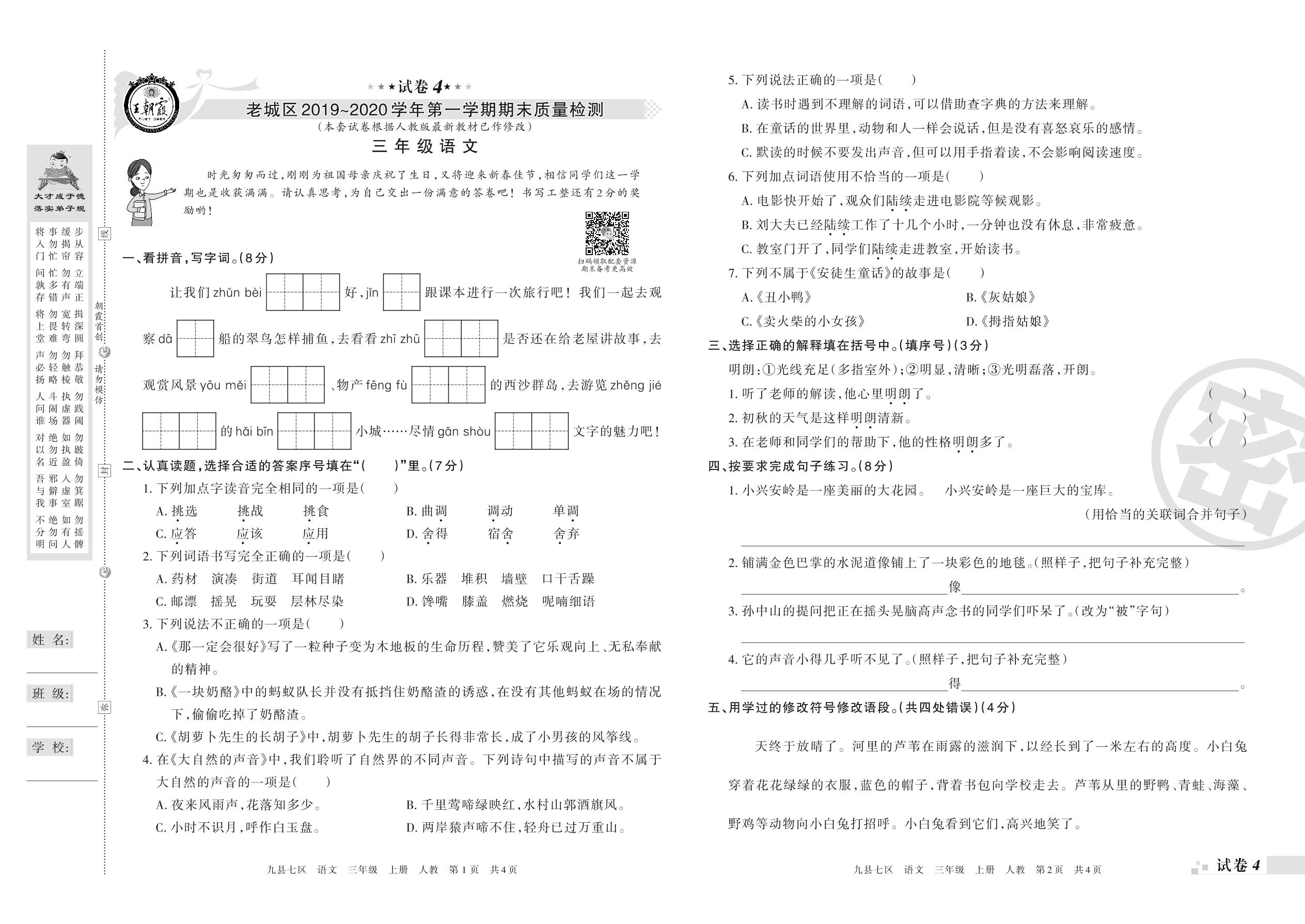 2019-2020学年第一学期洛阳市老城区三年级语文试卷(人教版)【4】