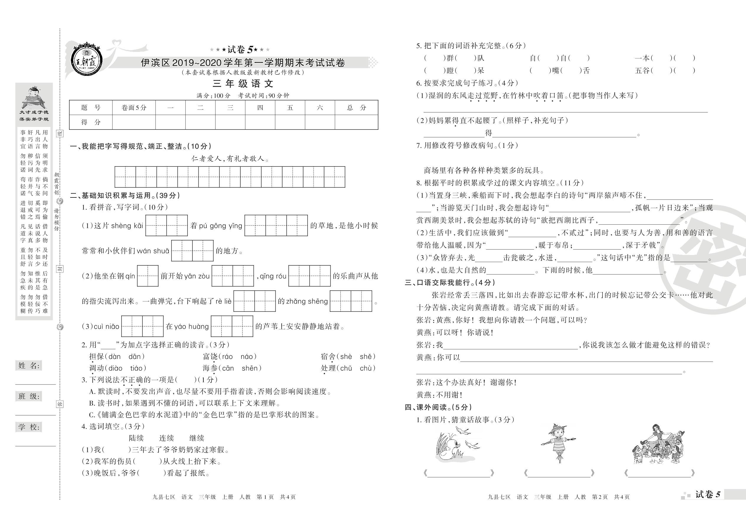 2019-2020学年第一学期洛阳市伊滨区三年级语文试卷(人教版)【5】