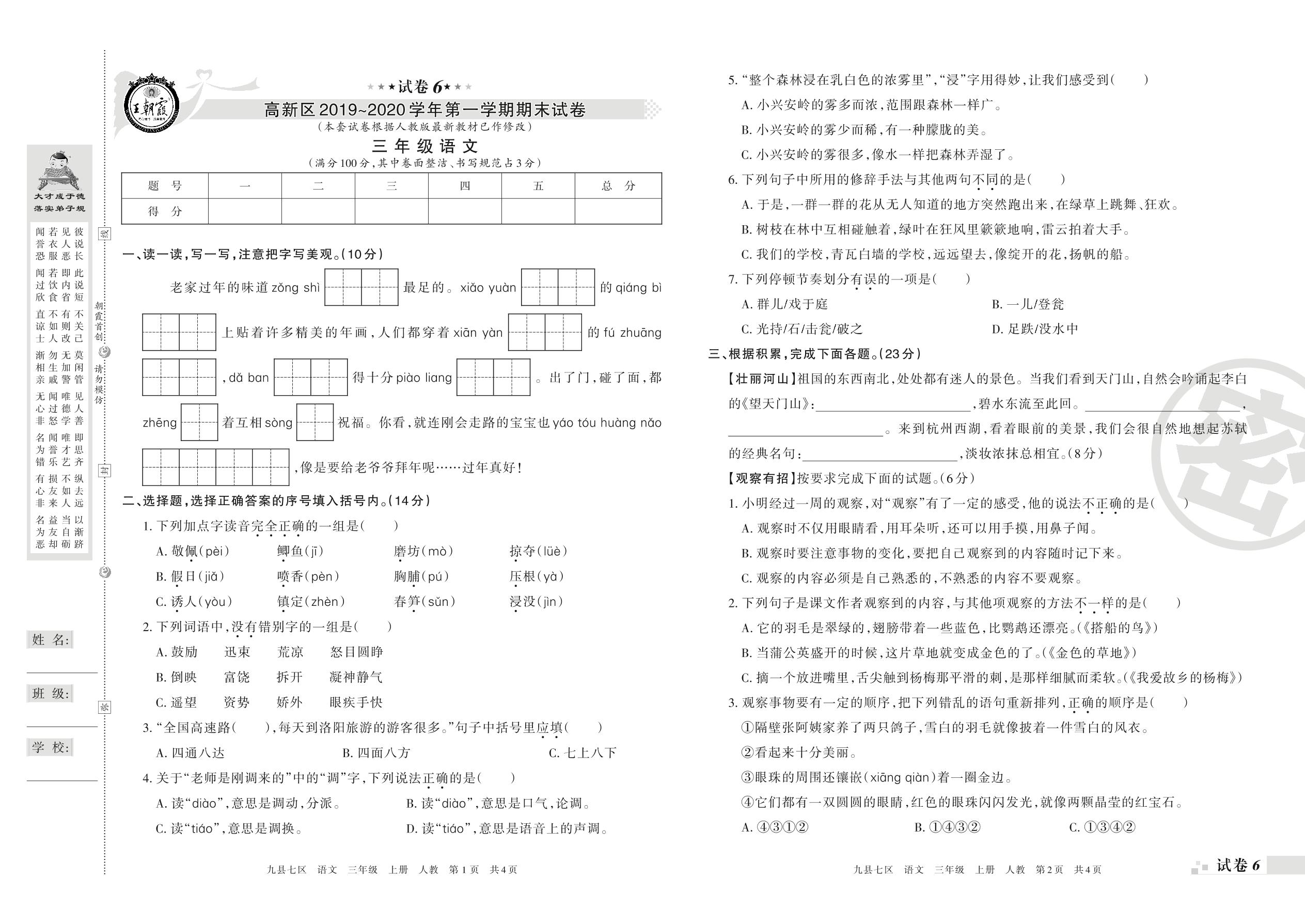 2019-2020学年第一学期洛阳市高新区三年级语文试卷(人教版)【6】