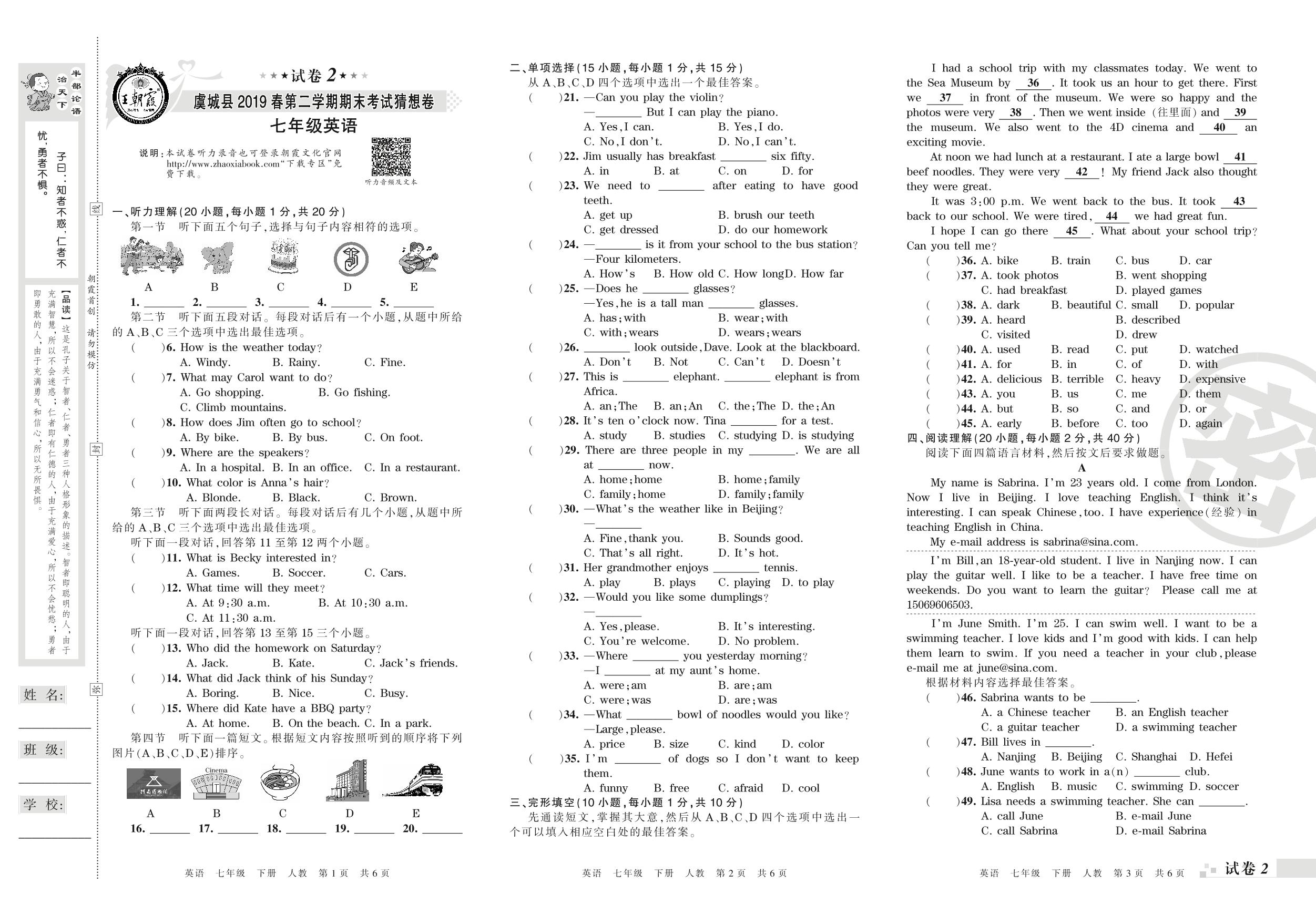 2018-2019学年第二学期商丘市虞城县猜想卷七年级英语试卷(人教版)【2】