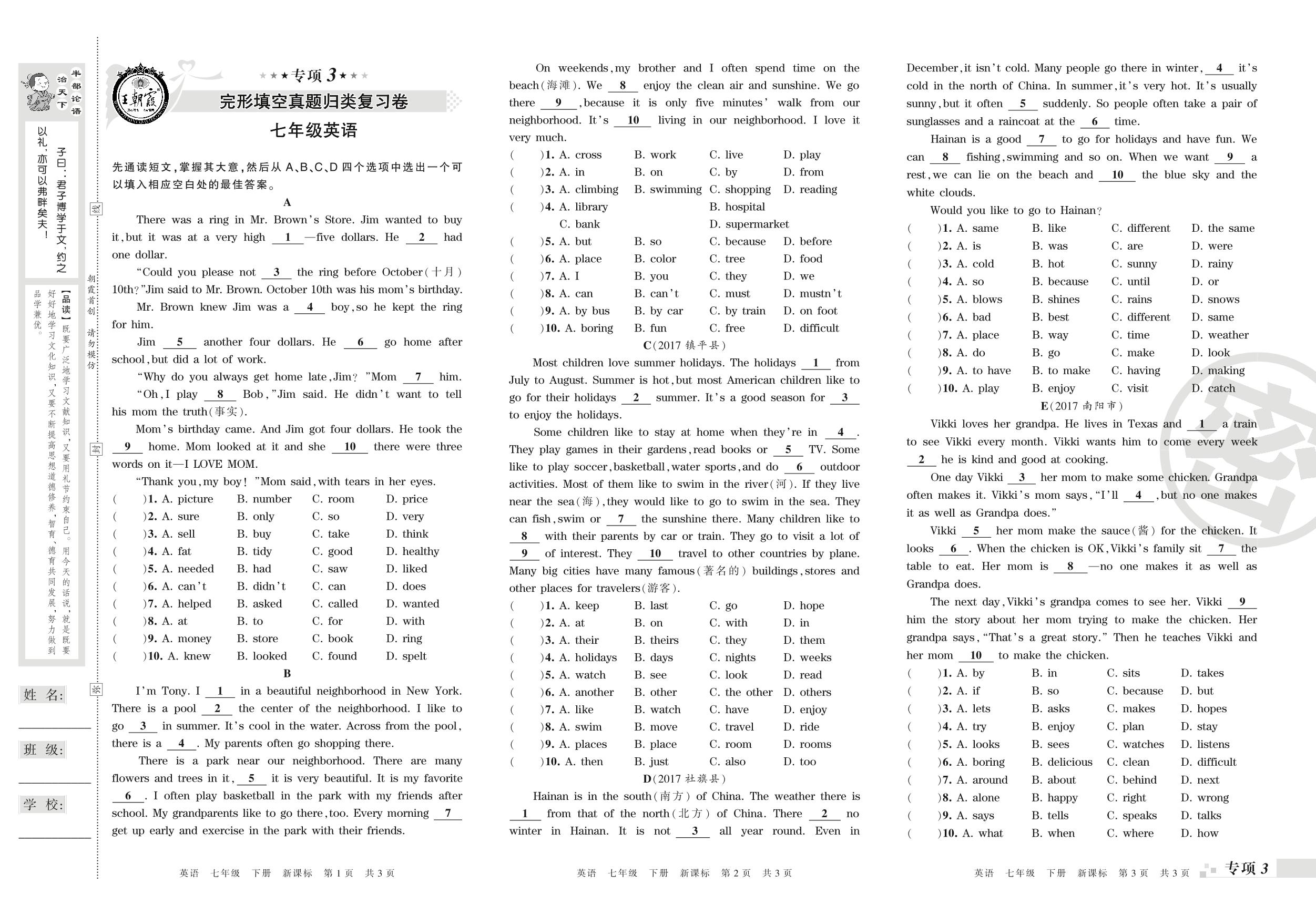 王朝霞期末专项卷——完形填空、选择型阅读真题归类复习卷七年级下册英语(新课版)_R210807201821【0】
