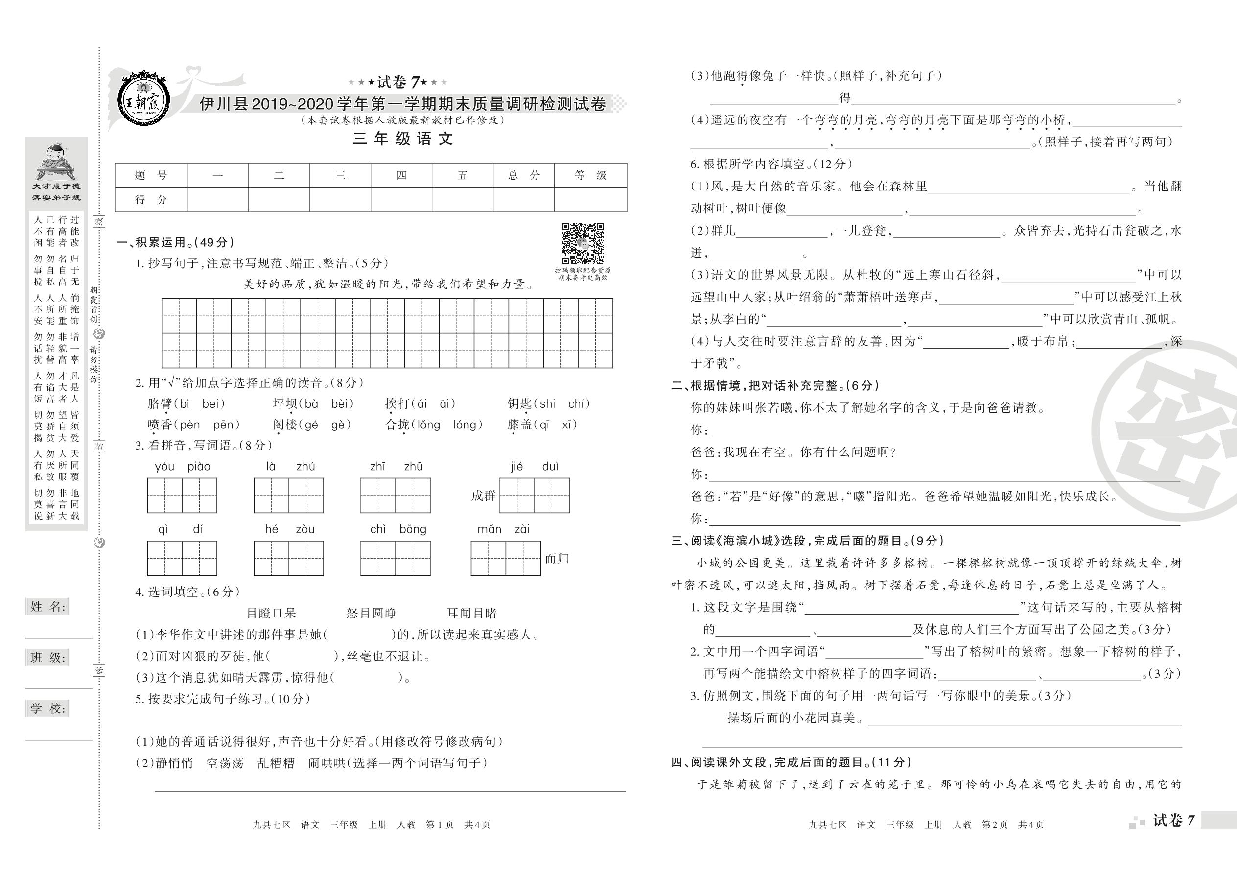 2019-2020学年第一学期洛阳市伊川县三年级语文试卷(人教版)【7】