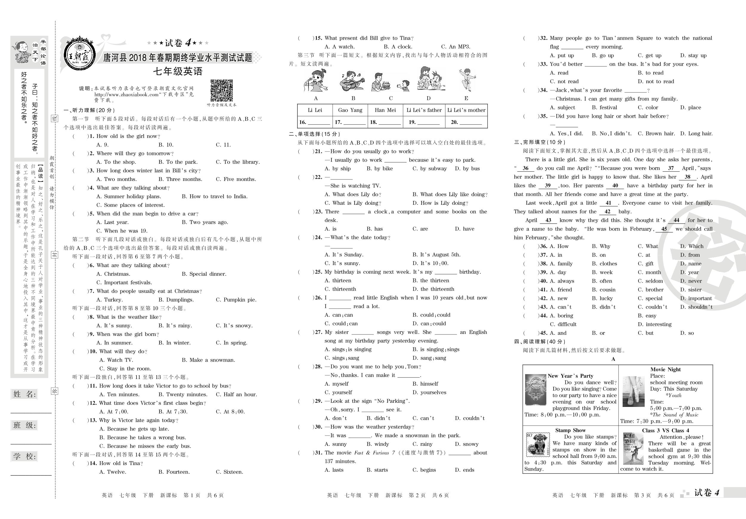 2017-2018学年第二学期南阳市唐河县七年级英语试卷(新课版)【4】