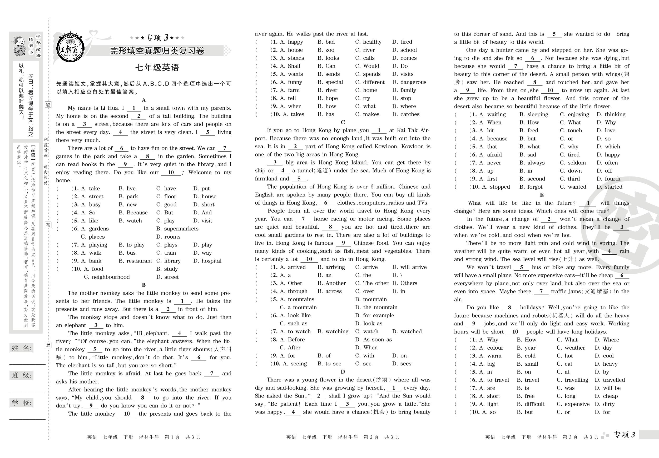 王朝霞期末专项卷——完形填空、选择型阅读真题归类复习卷七年级下册英语(译林版)_R210807202026【0】