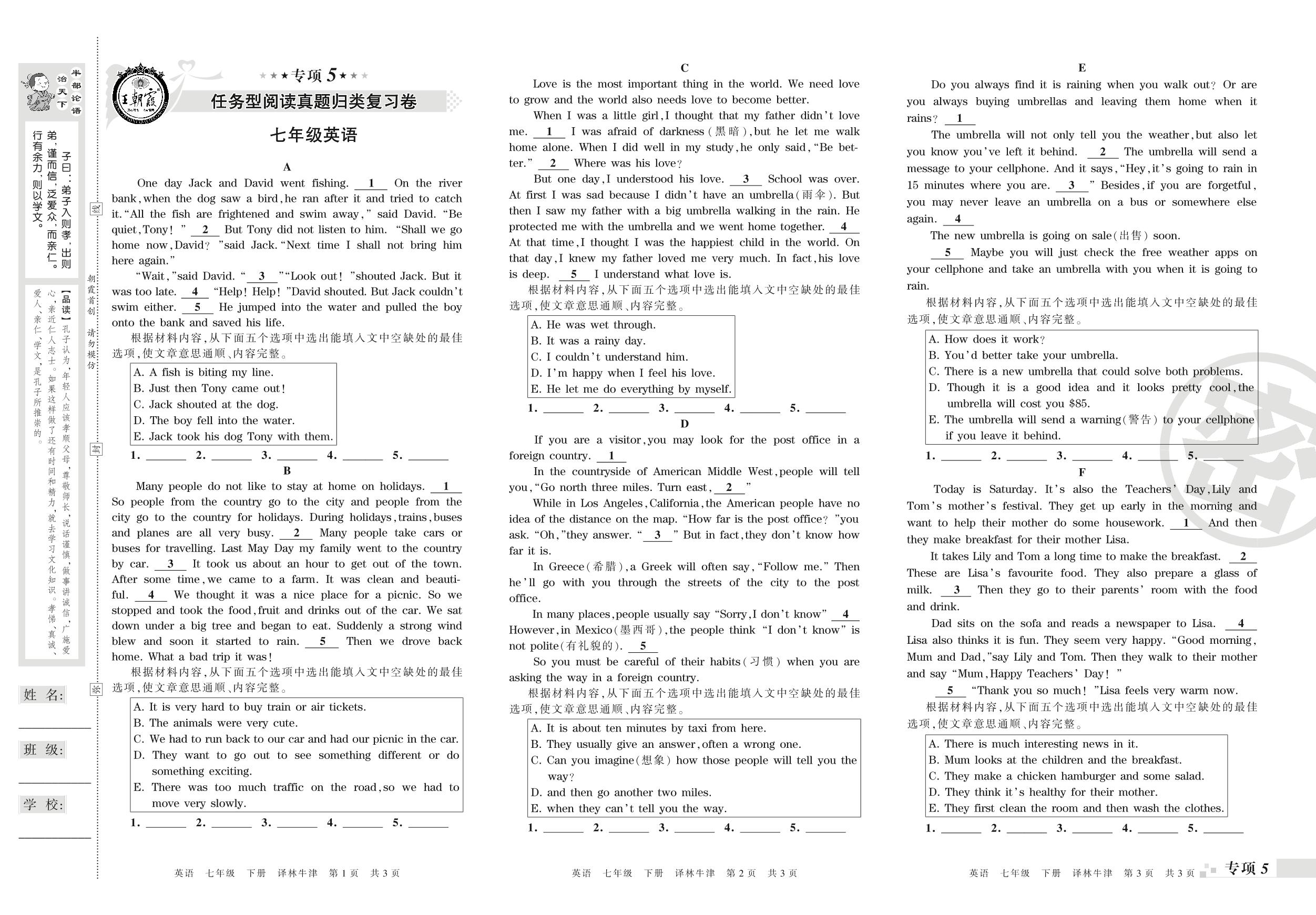 王朝霞期末专项卷——任务型阅读、词语运用真题归类复习卷七年级下册英语(译林版)_R210807202032【0】