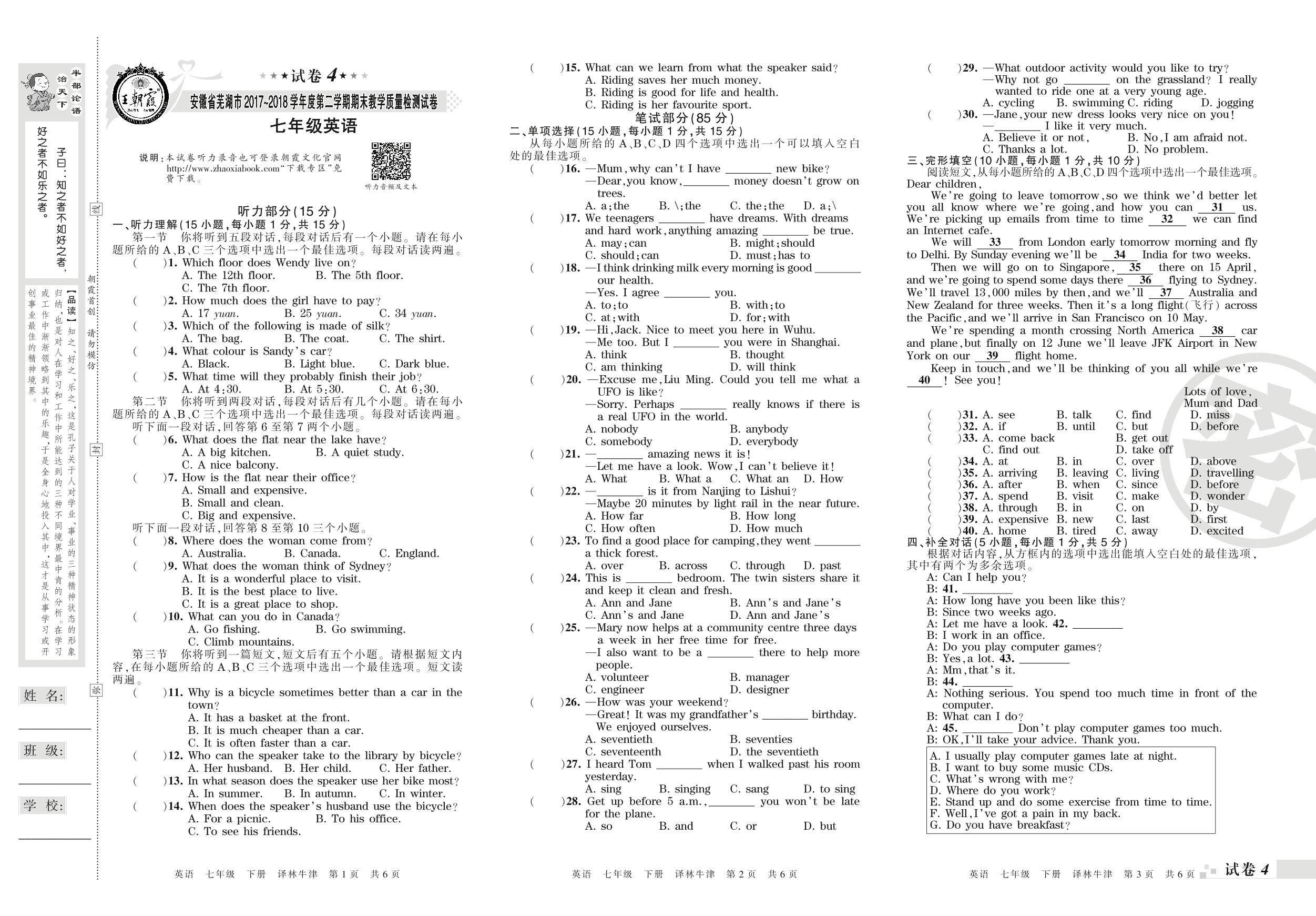 2017-2018学年第二学期安徽省芜湖市七年级英语试卷(译林版)【4】