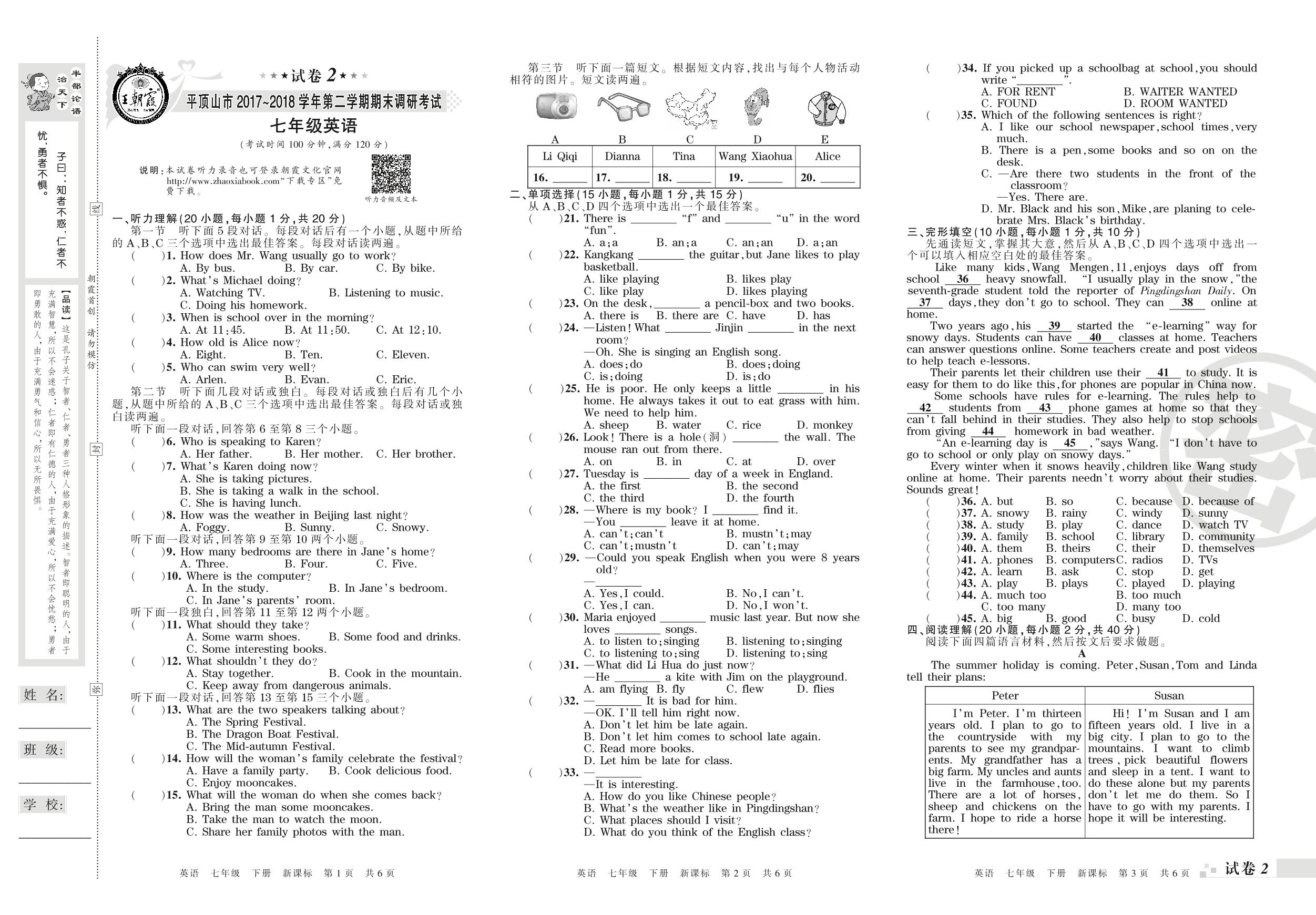 2017-2018学年第二学期平顶山市七年级下册英语(新课版)【2】