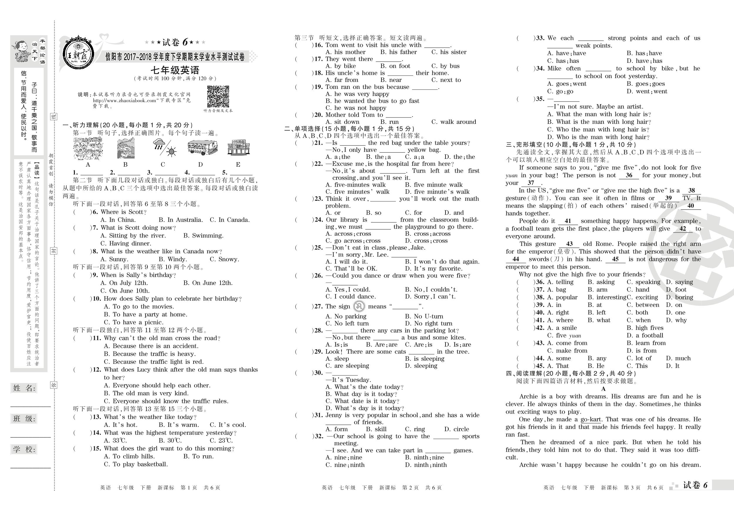 2017-2018学年第二学期信阳市七年级英语试卷(新课版)【6】