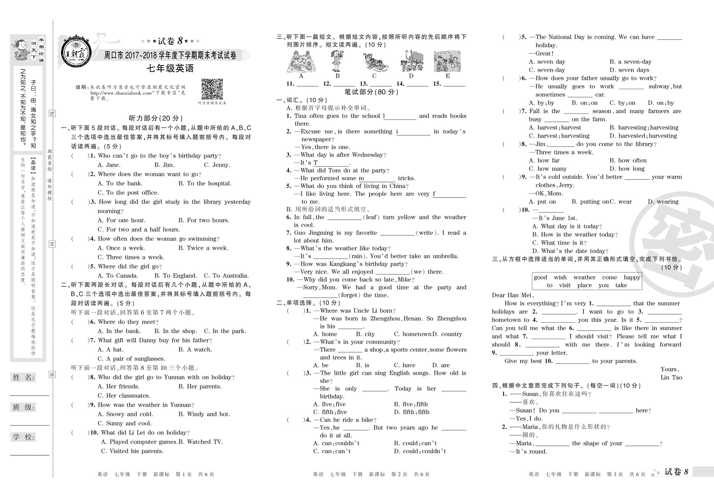2017-2018学年第二学期周口市七年级英语试卷(新课版)【8】