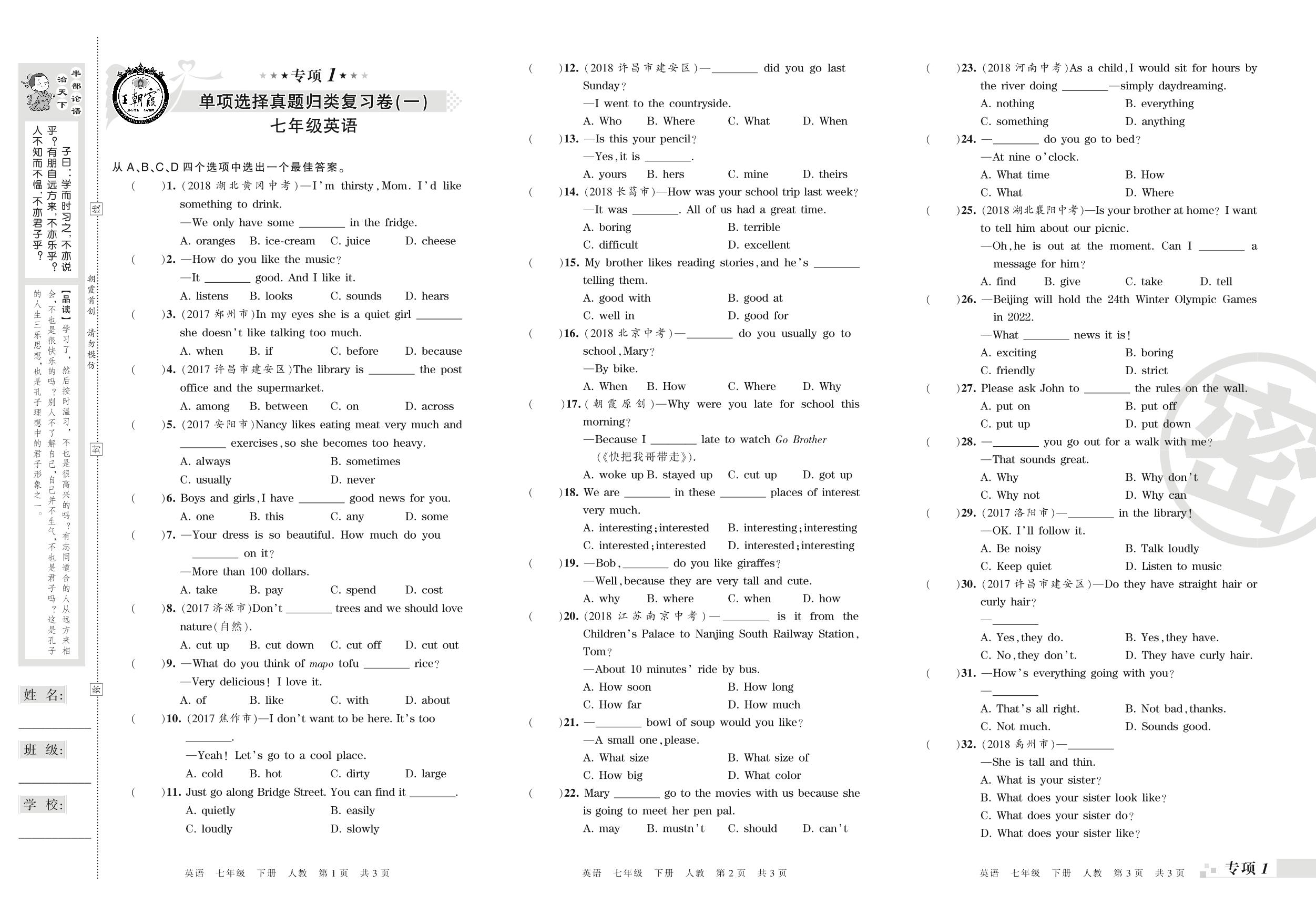 王朝霞期末专项卷——单项选择(一)(二)真题归类复习卷七年级下册英语(人教版)_R210807202348【0】