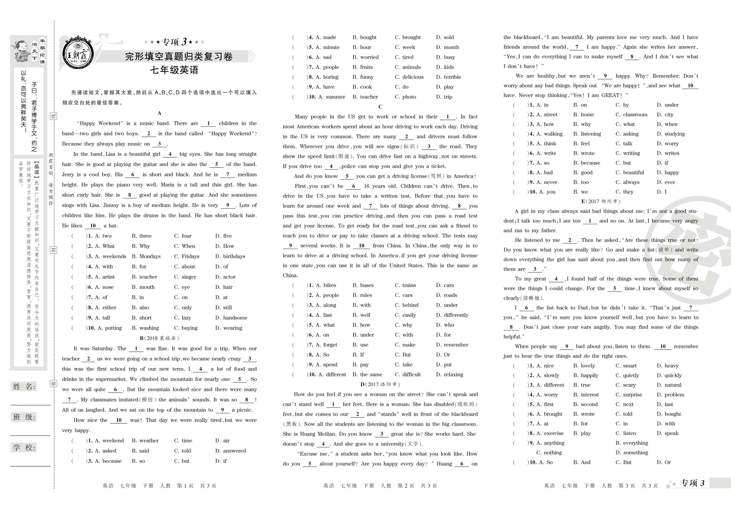 王朝霞期末专项卷——完形填空、选择型阅读真题归类复习卷七年级下册英语(人教版)_R210807202352【0】