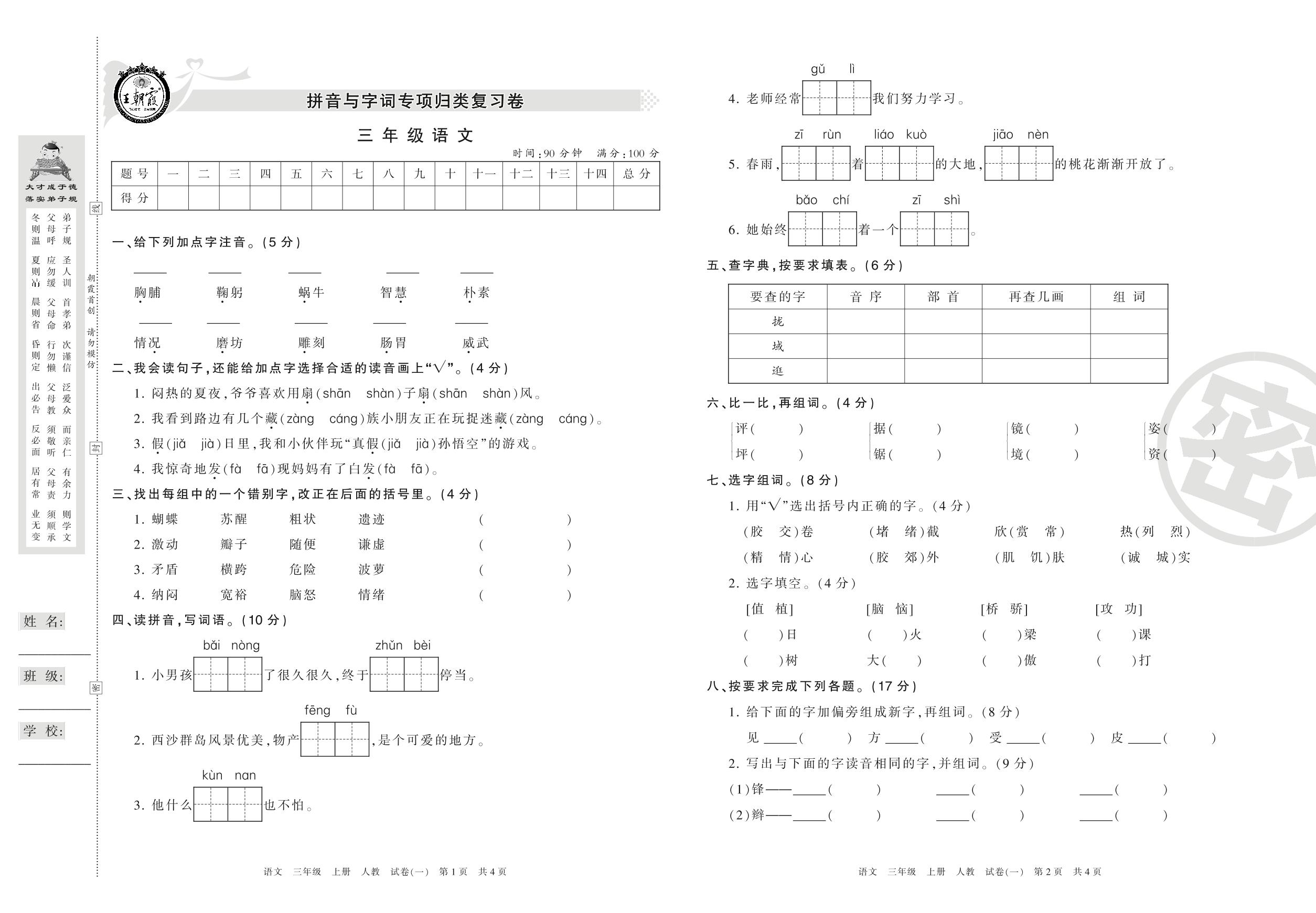 王朝霞期末专项卷——拼音与字词专项归类复习三年级上册语文(人教版)【1】
