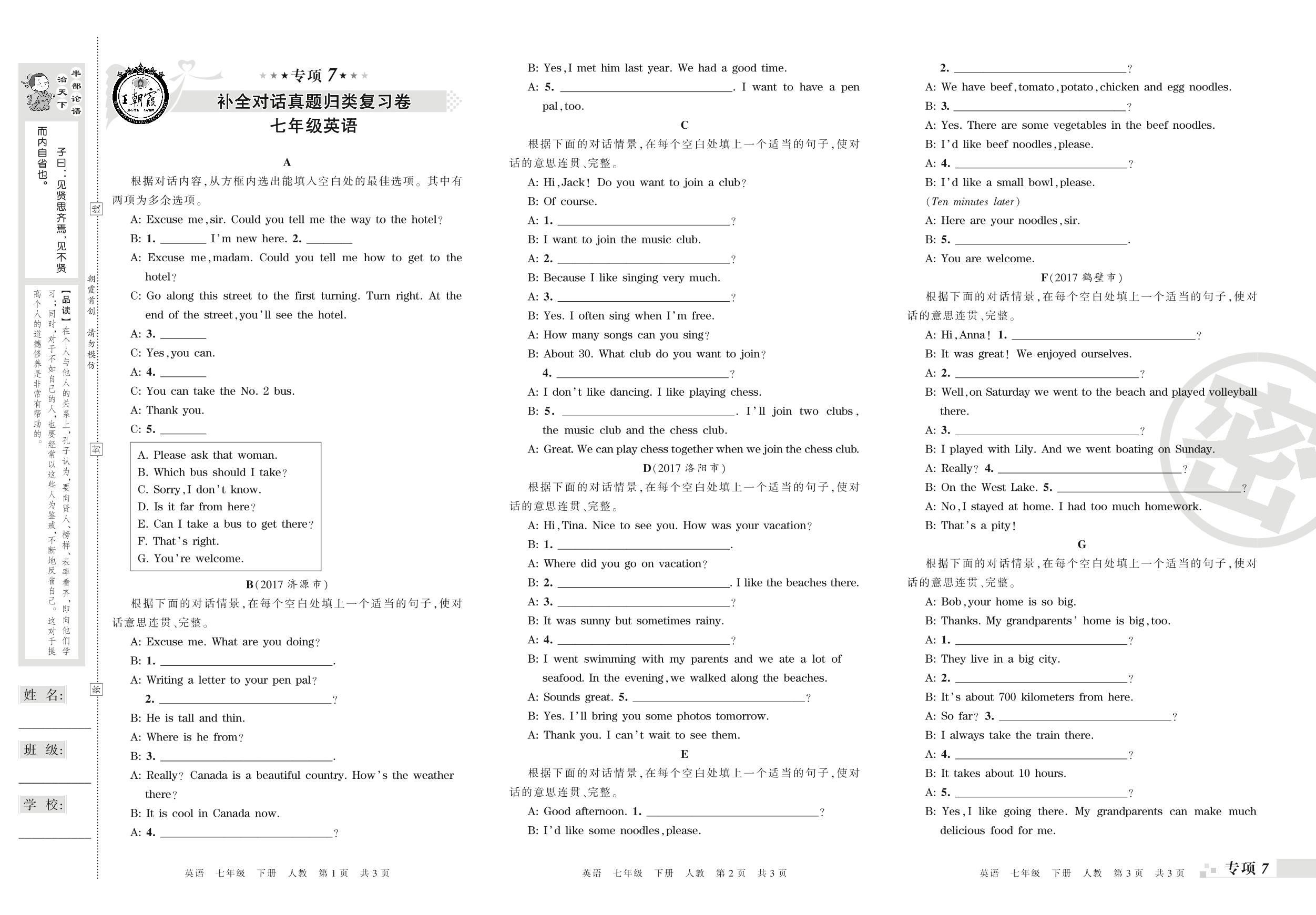 王朝霞期末专项卷——补全对话、书面表达真题归类复习卷七年级下册英语(人教版)_R210807202402【0】