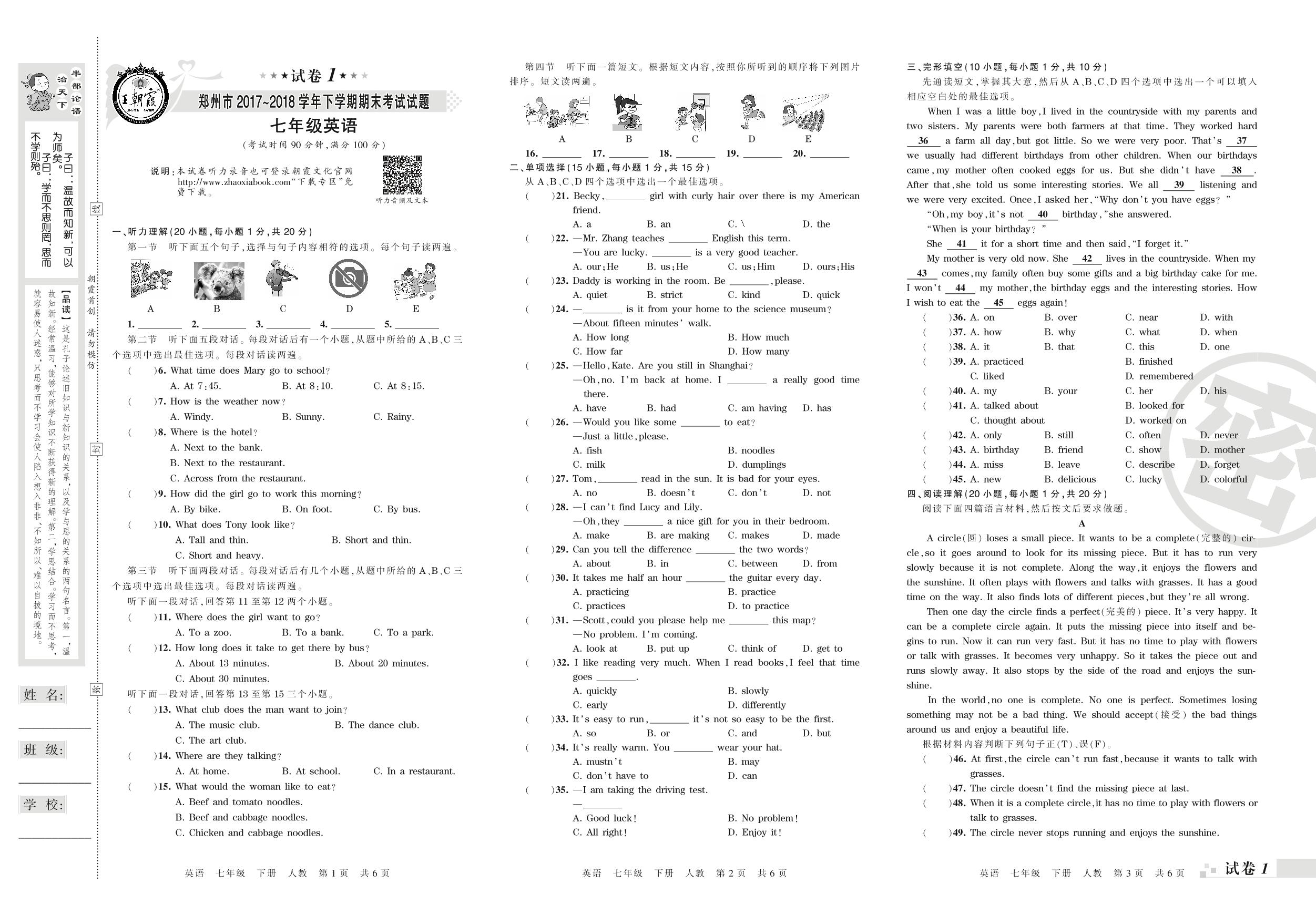 2017-2018学年第二学期郑州市七年级英语试卷(人教版)_R210807202406【1】
