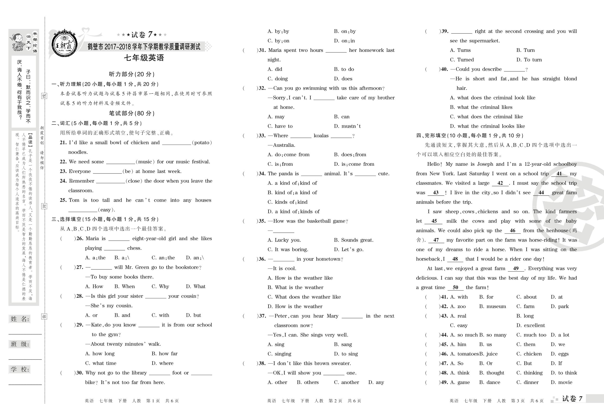 2017-2018学年第二学期鹤壁市七年级英语试卷(人教版)【7】
