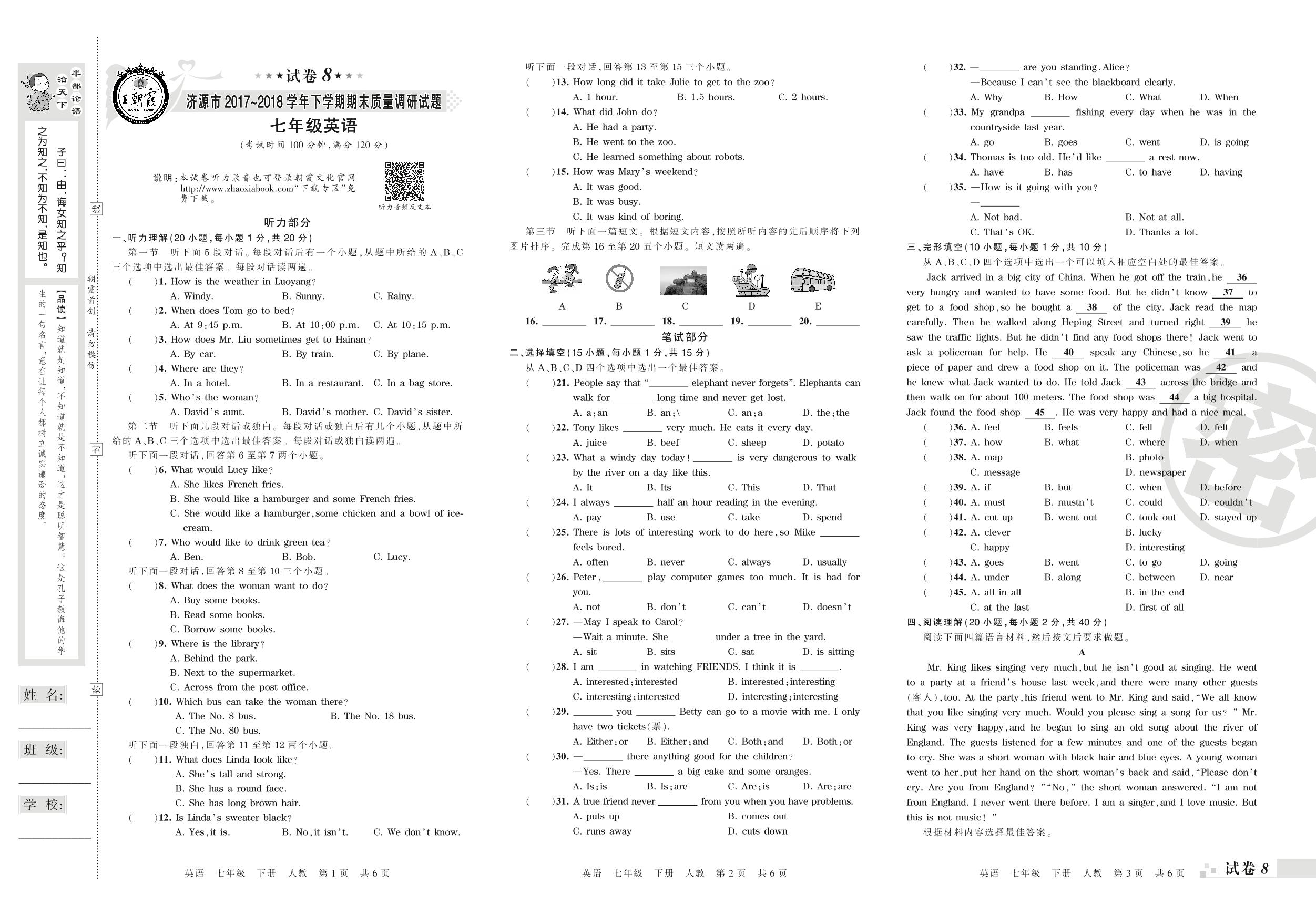 2017-2018学年第二学期济源市七年级英语试卷(人教版)【8】