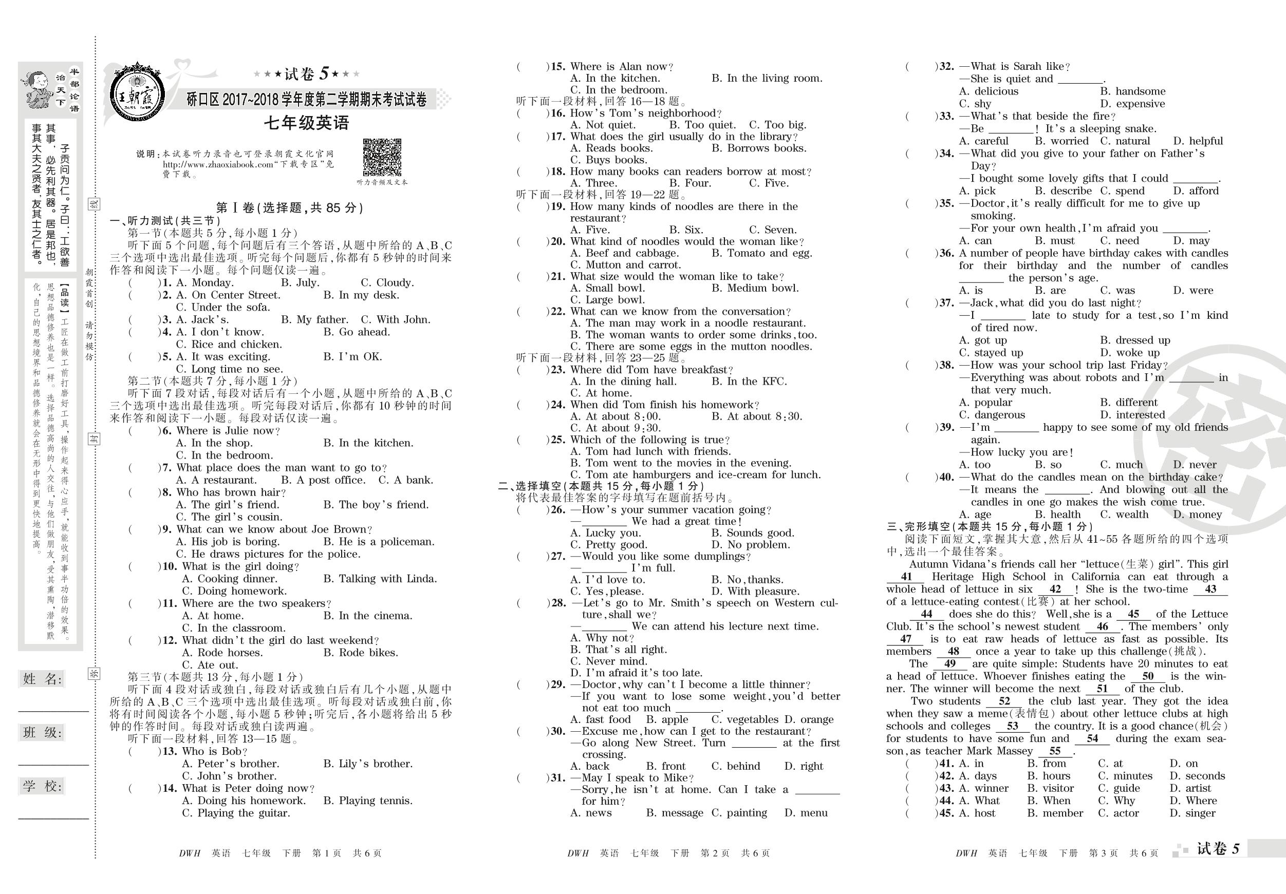 2017-2018学年第二学期武汉市硚口区七年级英语试卷(人教版)【5】