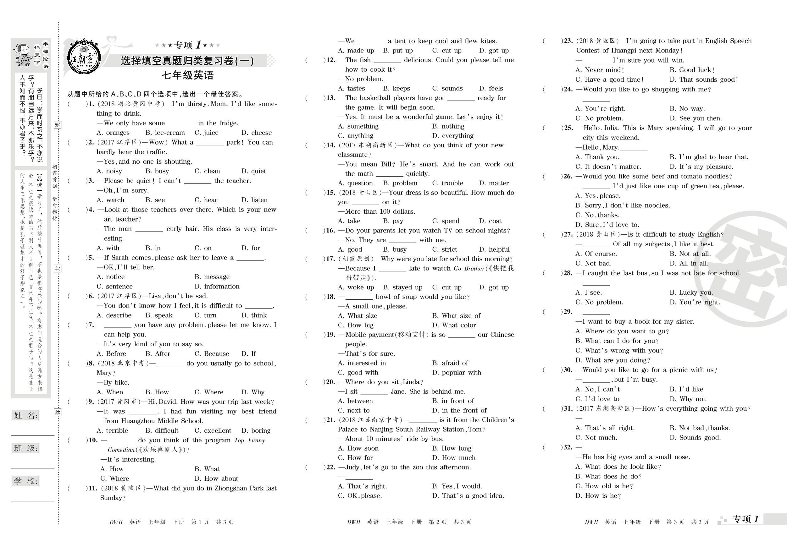 王朝霞期末专项卷——选择填空(一)(二)真题归类复习卷七年级下册英语(人教版)_R210807202625【0】