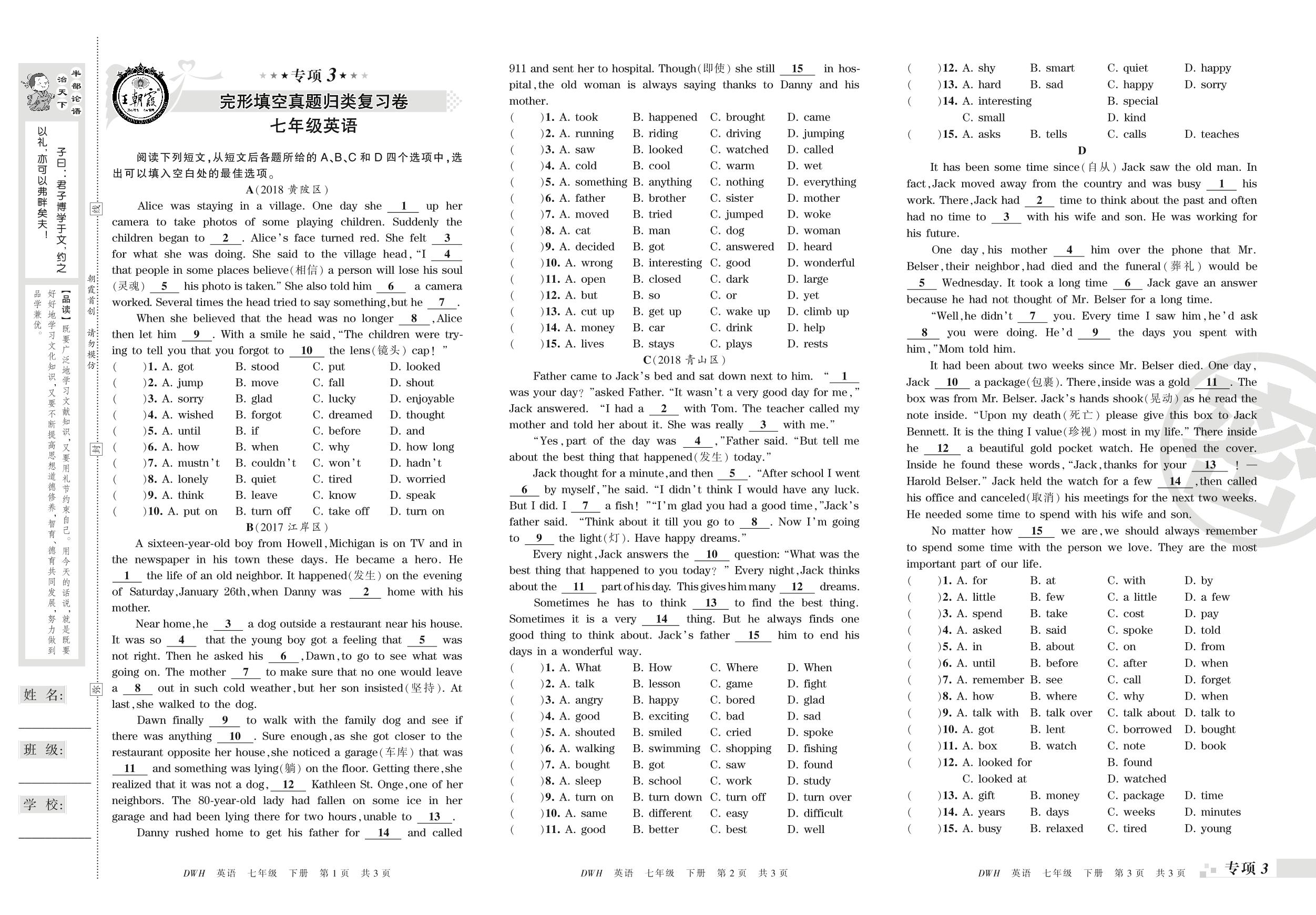 王朝霞期末专项卷——完形填空、阅读理解(一)真题归类复习卷七年级下册英语(人教版)_R210807202631【0】