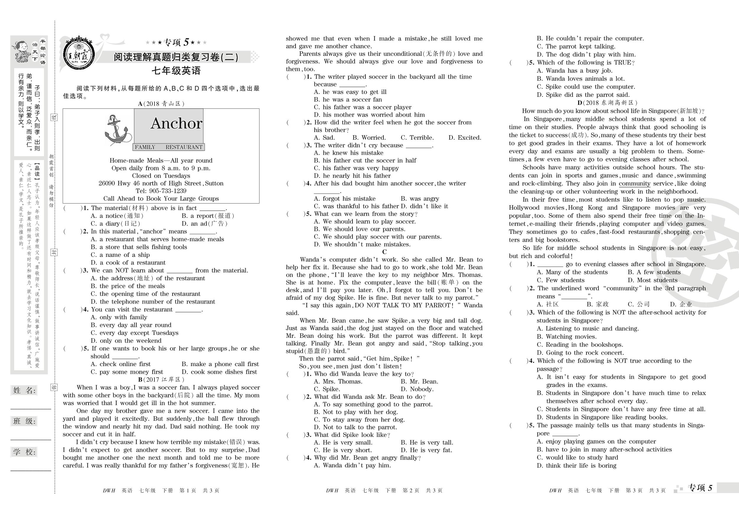 王朝霞期末专项卷——阅读理解(二)、词与短语填空真题归类复习卷七年级下册英语(人教版)_R210807202638【0】