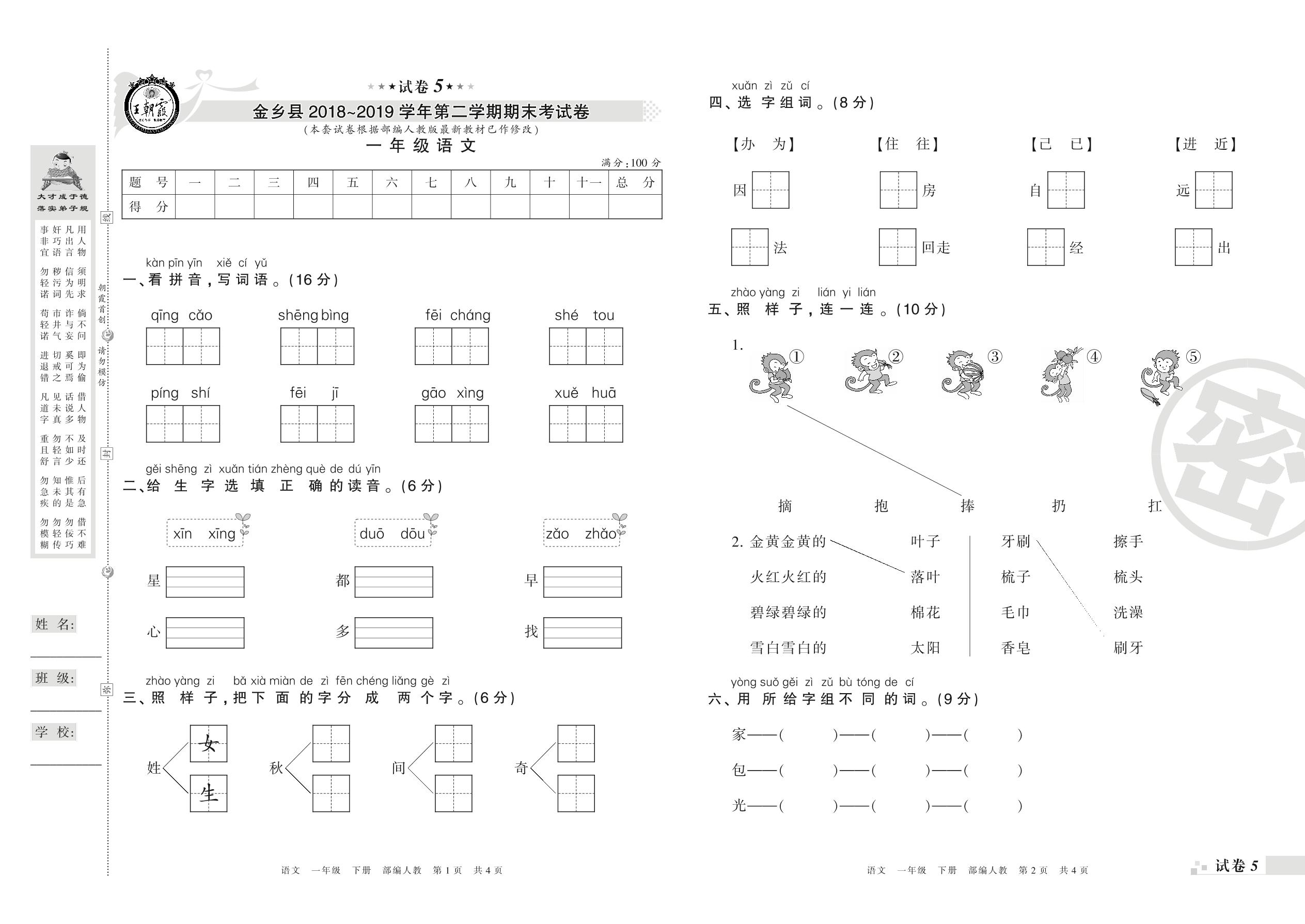 2018-2019学年第二学期济宁市金乡县一年级语文试卷(人教版)【5】
