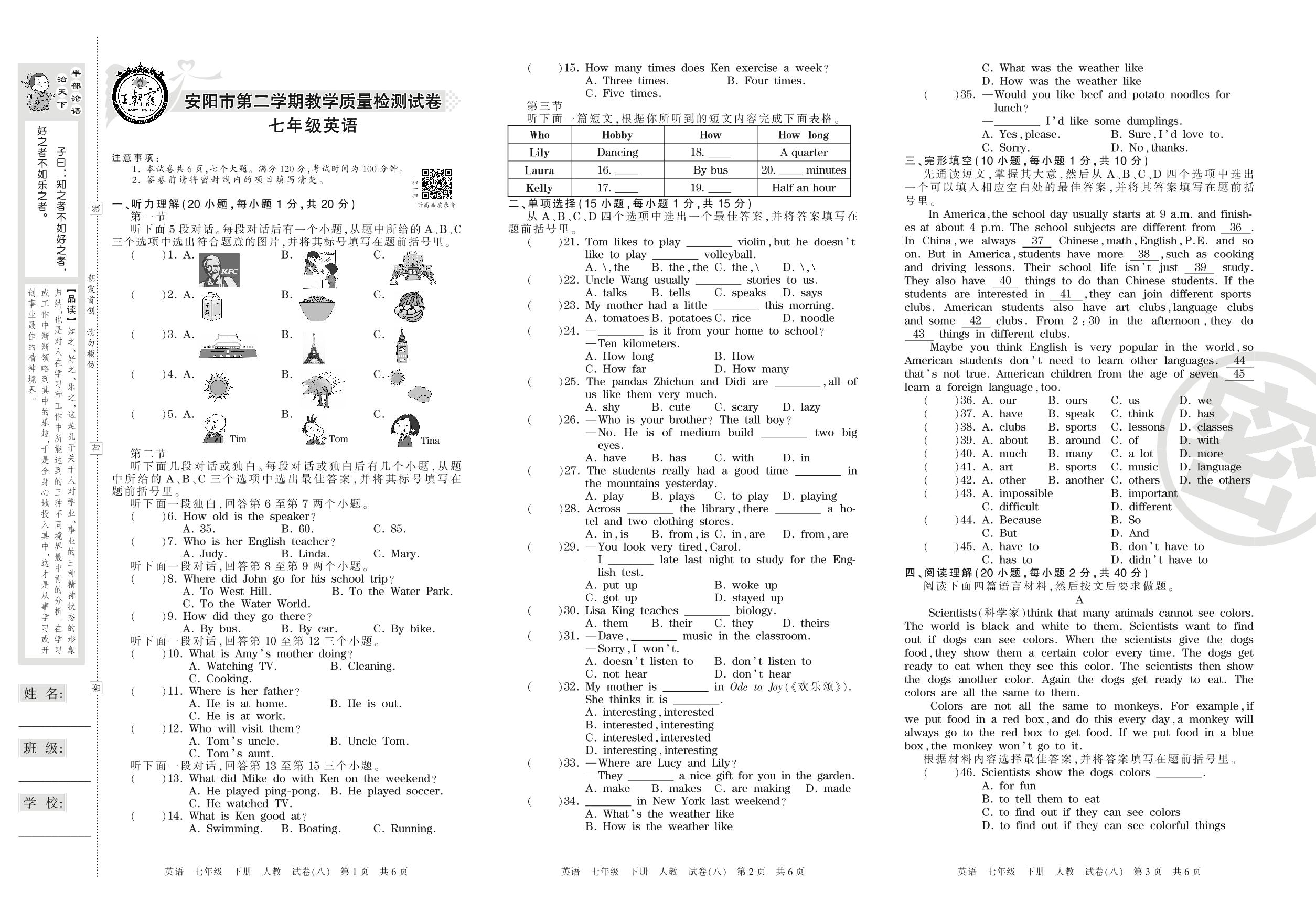 2015-2016学年第二学期安阳市七年级英语试卷(人教版)【8】