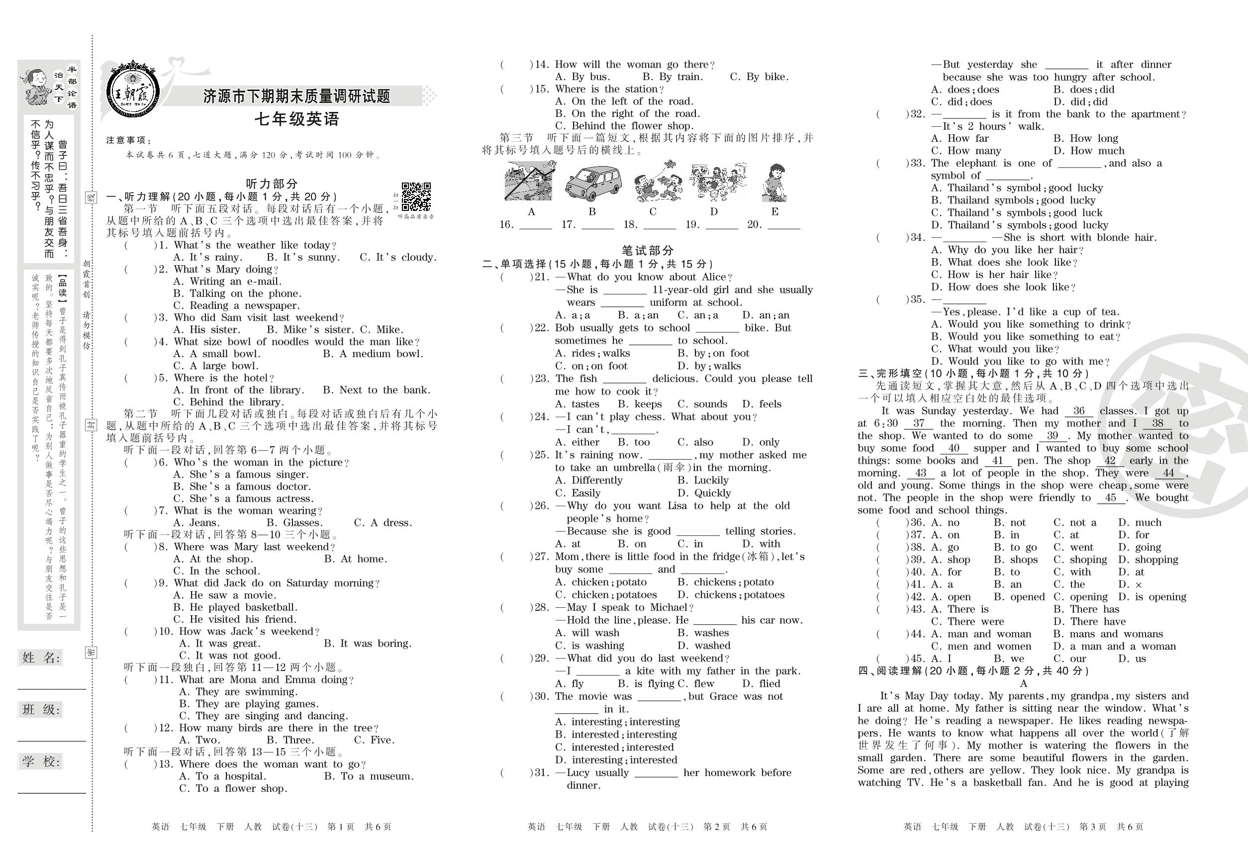 2015-2016学年第二学期济源市七年级英语试卷(人教版)【13】