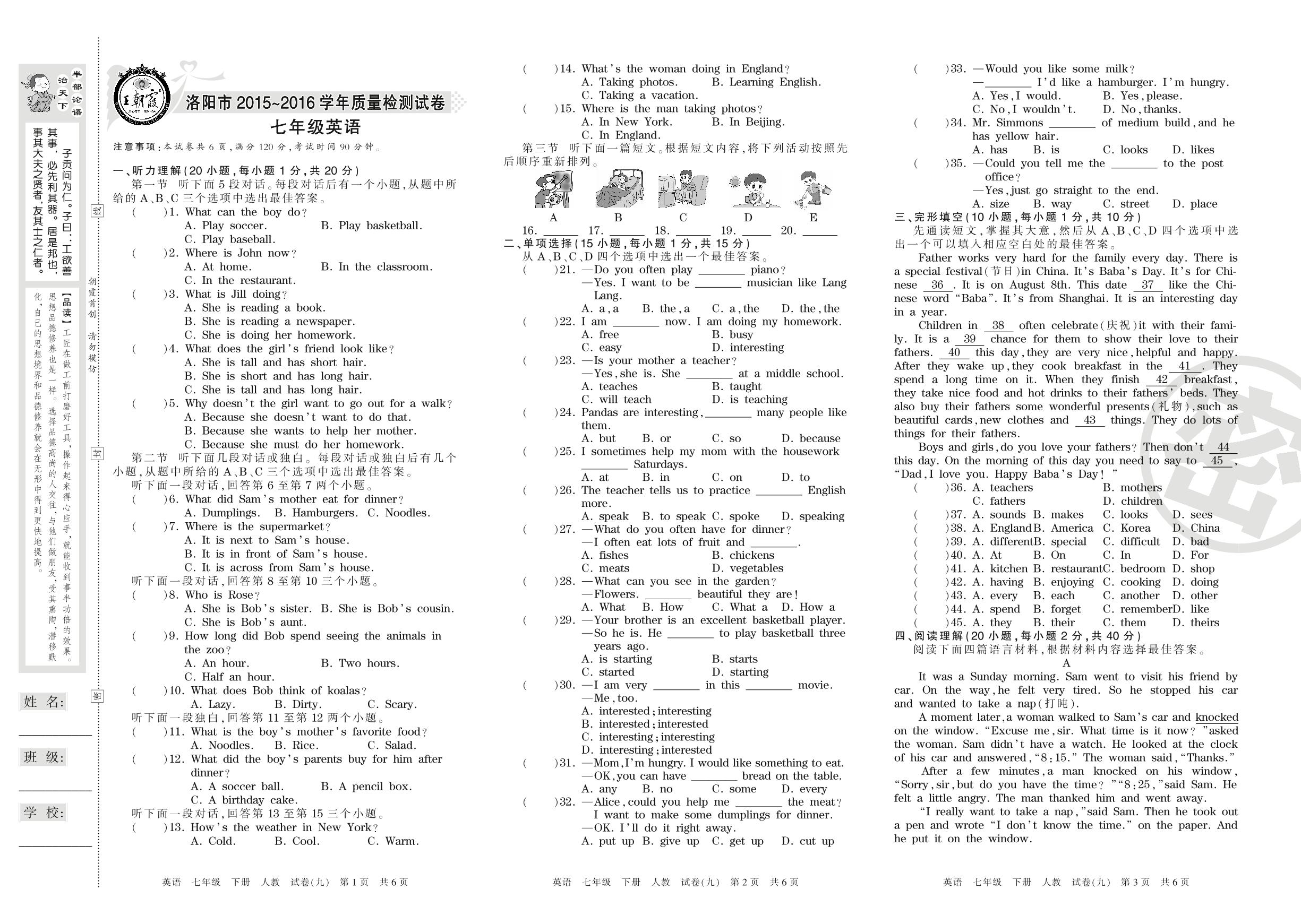2015-2016学年第二学期洛阳市七年级英语试卷(人教版)【9】