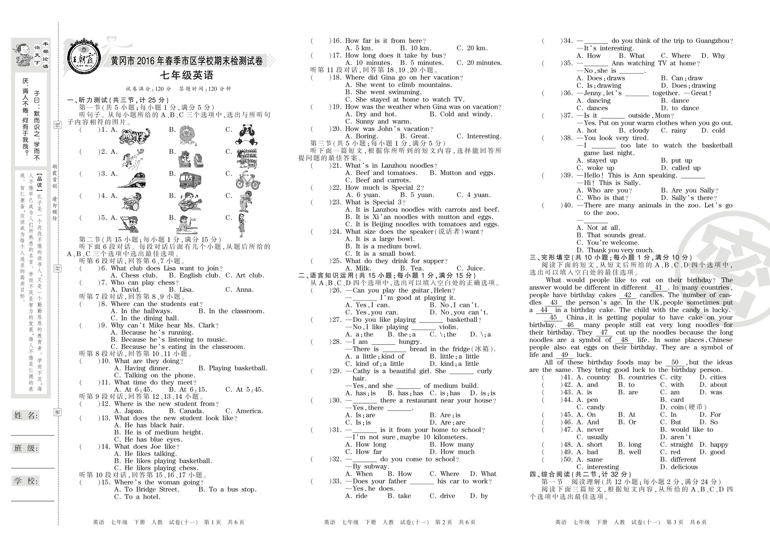 2015-2016学年第二学期黄冈市七年级英语试卷(人教版)【11】