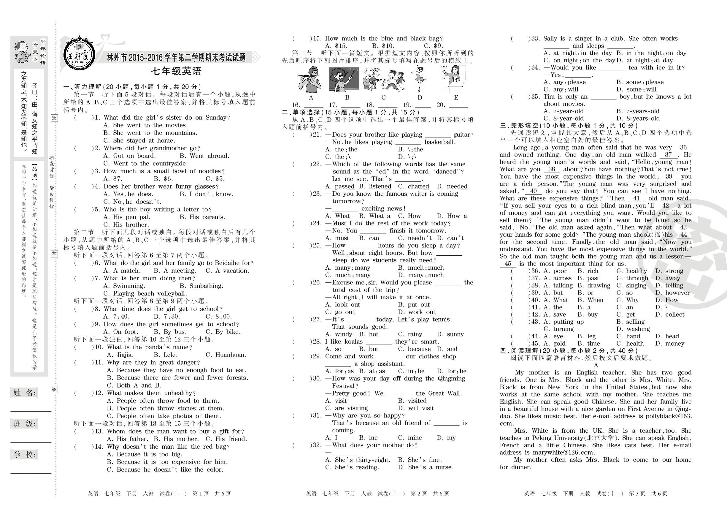 2015-2016学年第二学期林州市七年级英语试卷(人教版)【12】
