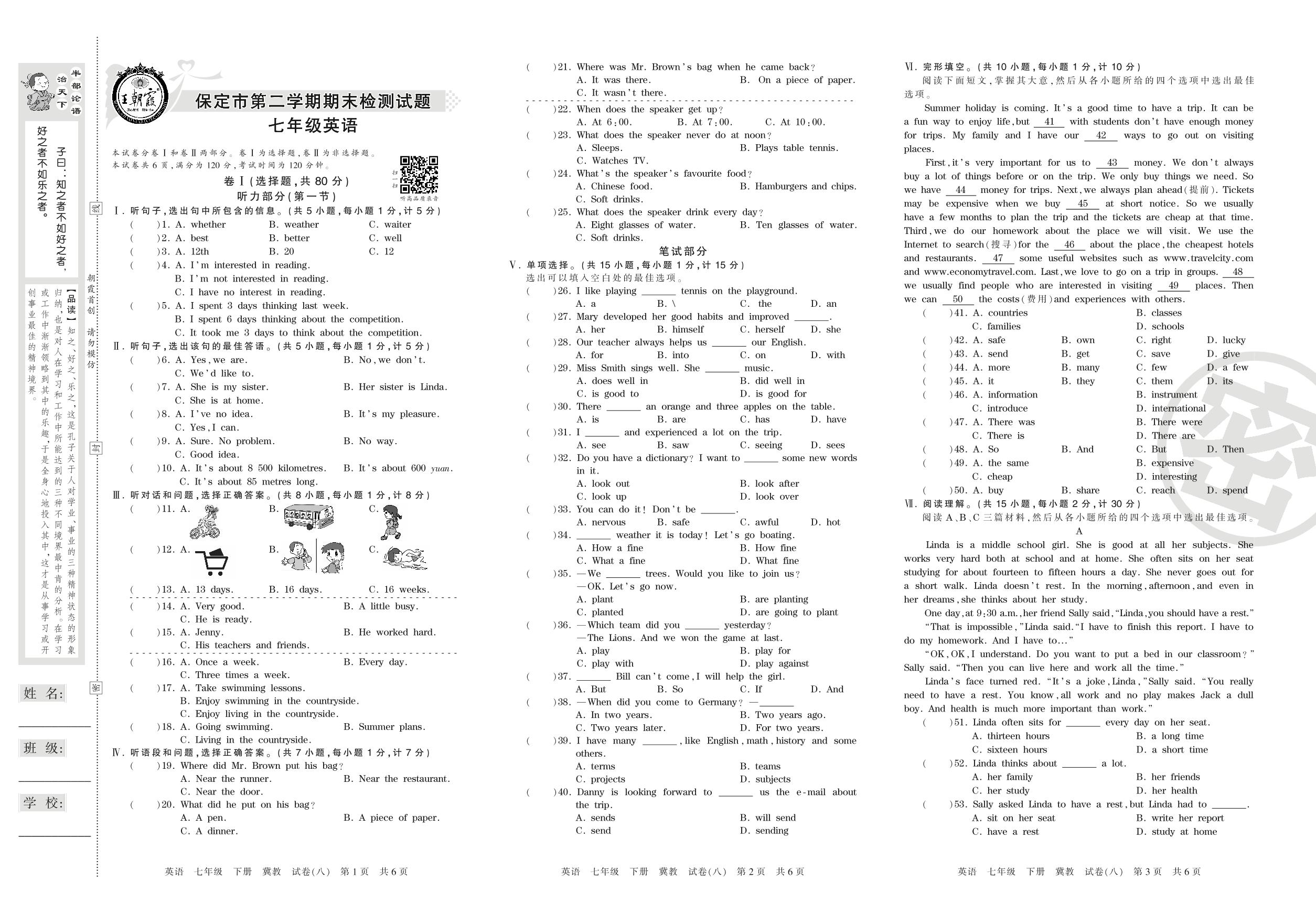 七年级英语冀教版下册期末卷