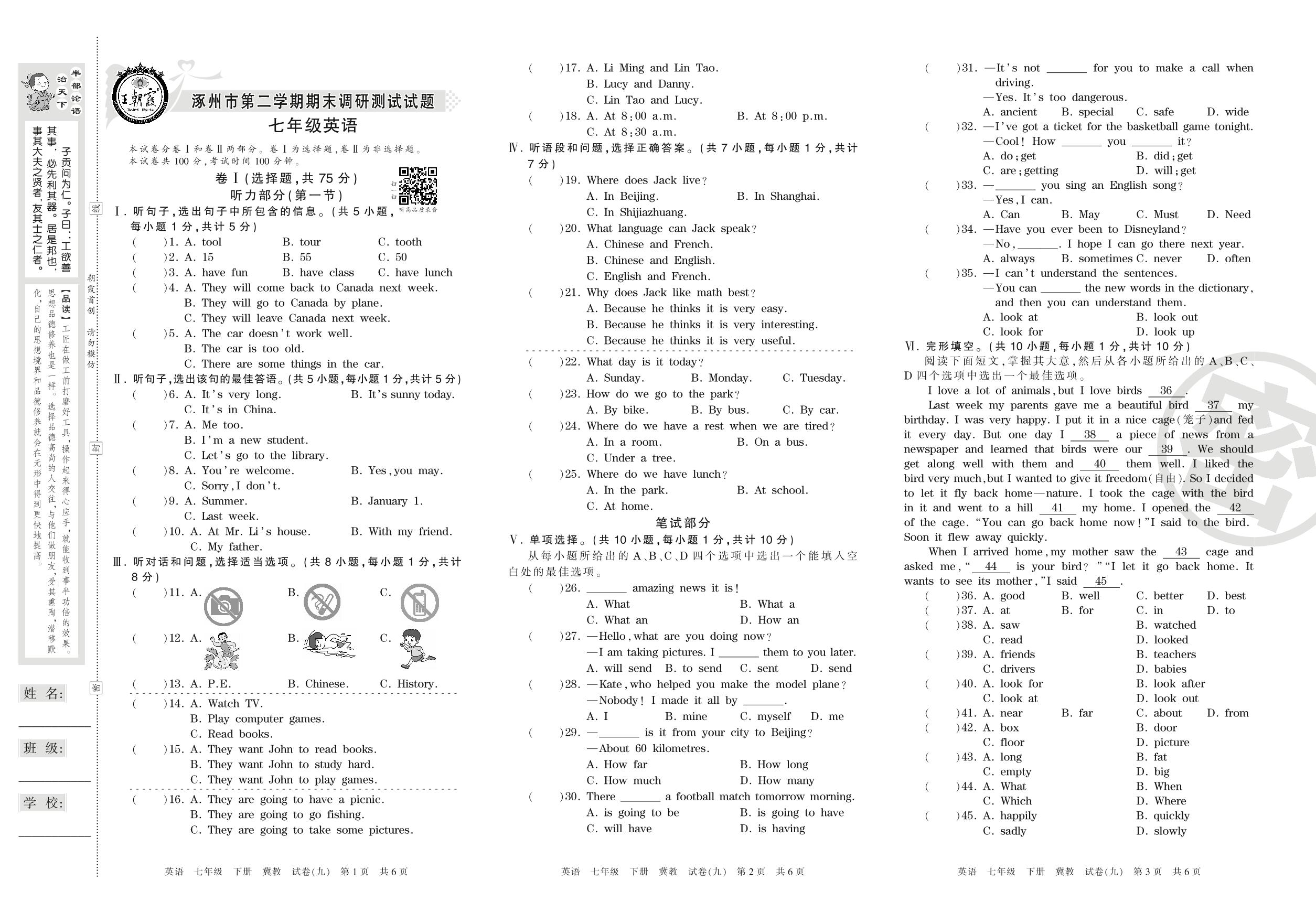 2015-2016学年第二学期涿州市七年级英语试卷(冀教版)【9】