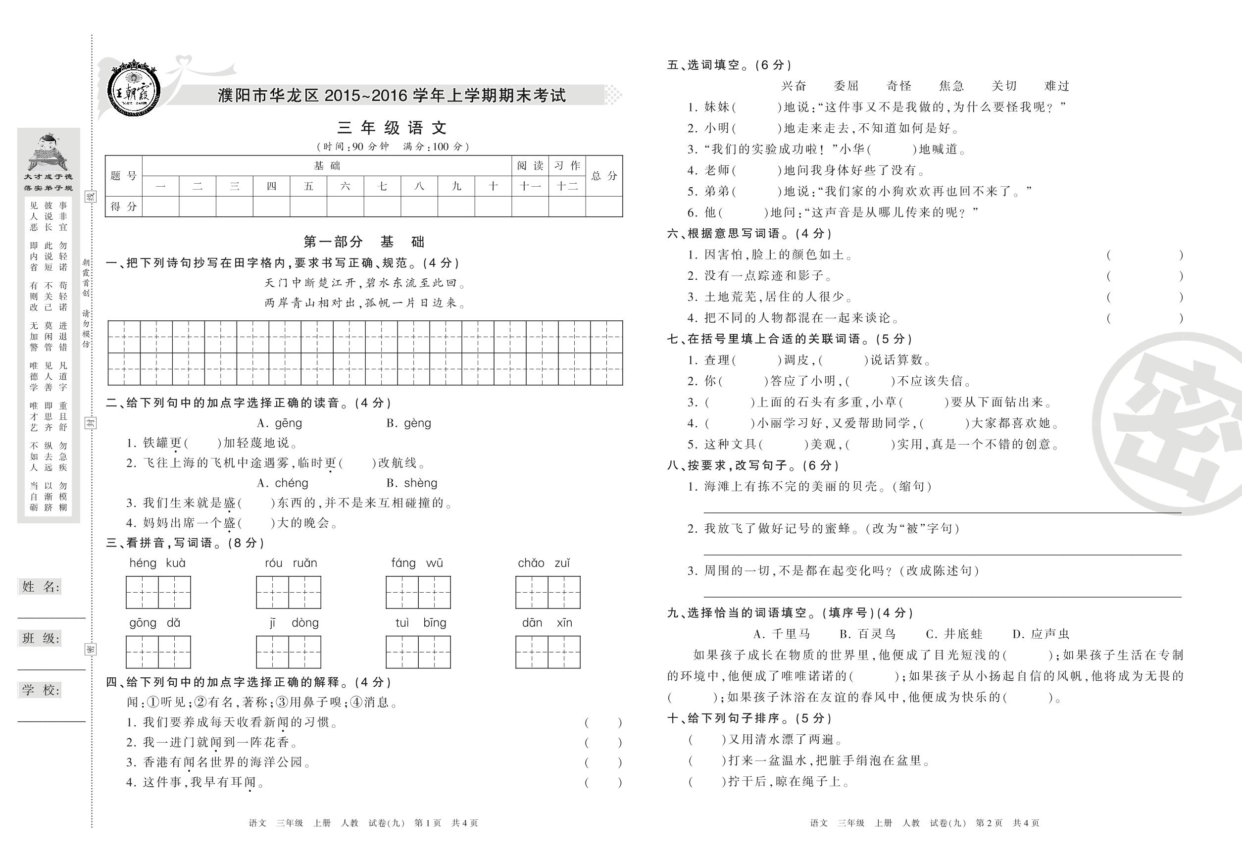 2015-2016学年第一学期濮阳市华龙区三年级语文试卷(人教版)【9】