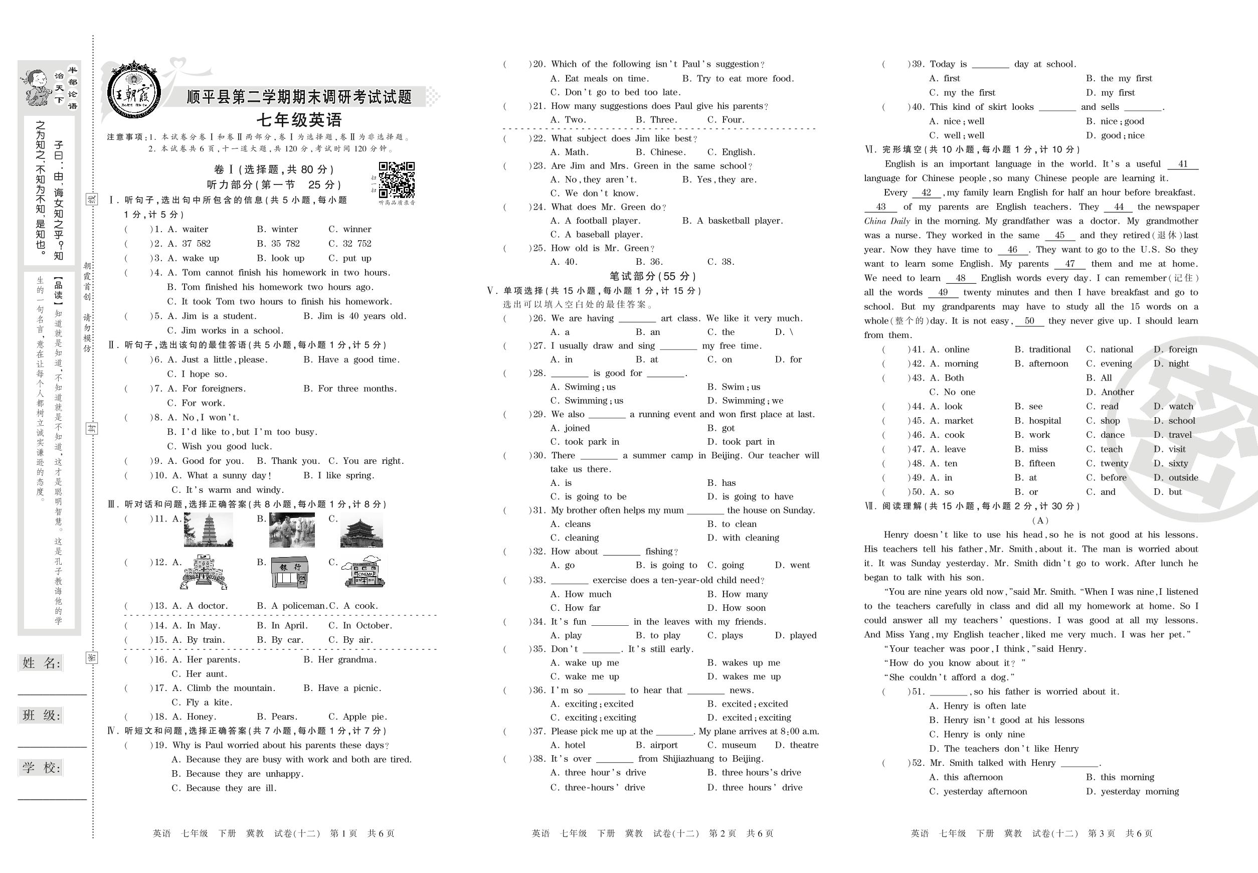 七年级英语冀教版下册期末卷