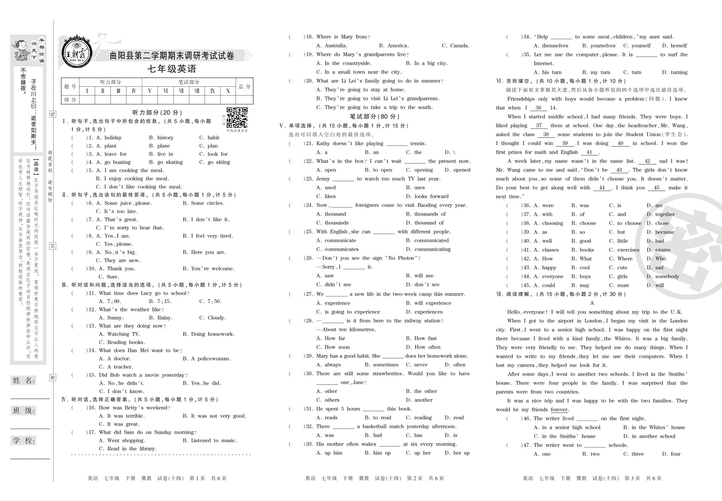 七年级英语冀教版下册期末卷