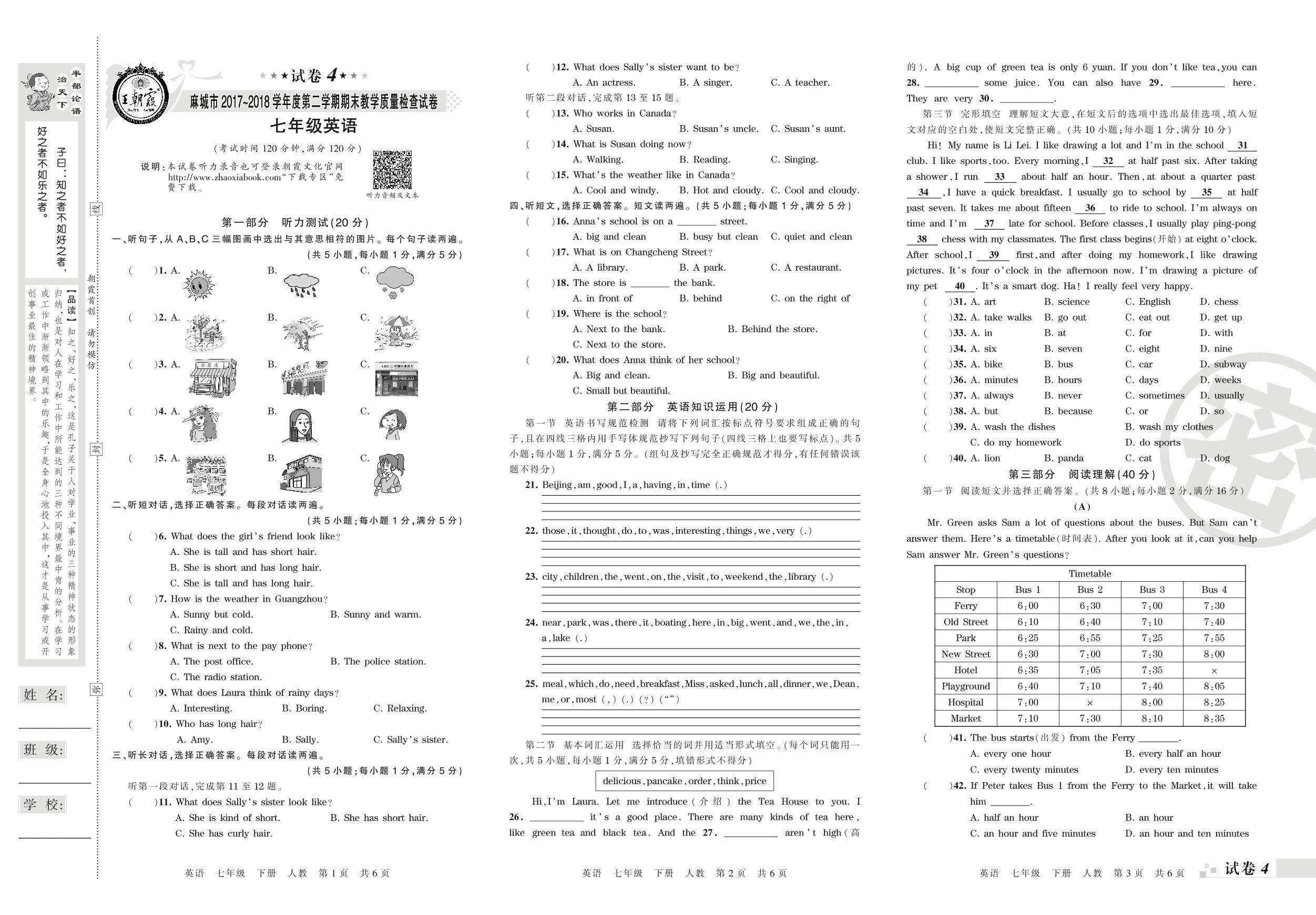 2017-2018学年第二学期麻城市七年级英语试卷(人教版)【4】