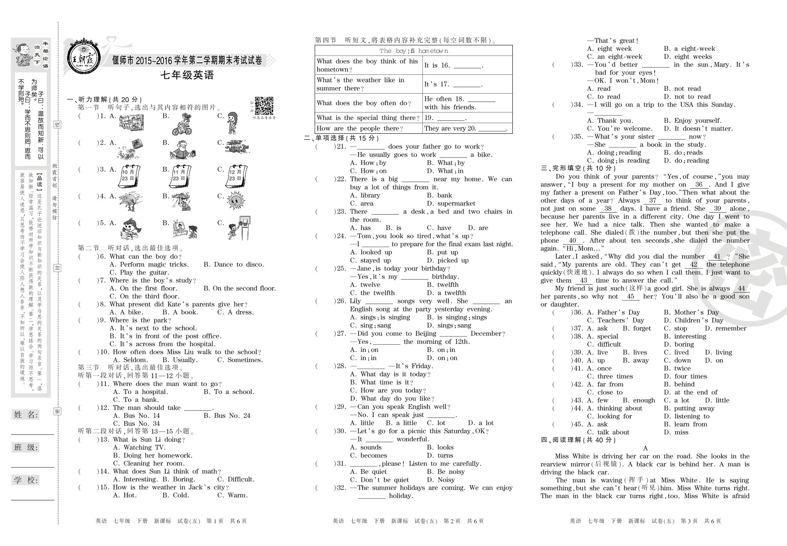 2015-2016学年第二学期偃师市七年级英语试卷(新课版)【5】