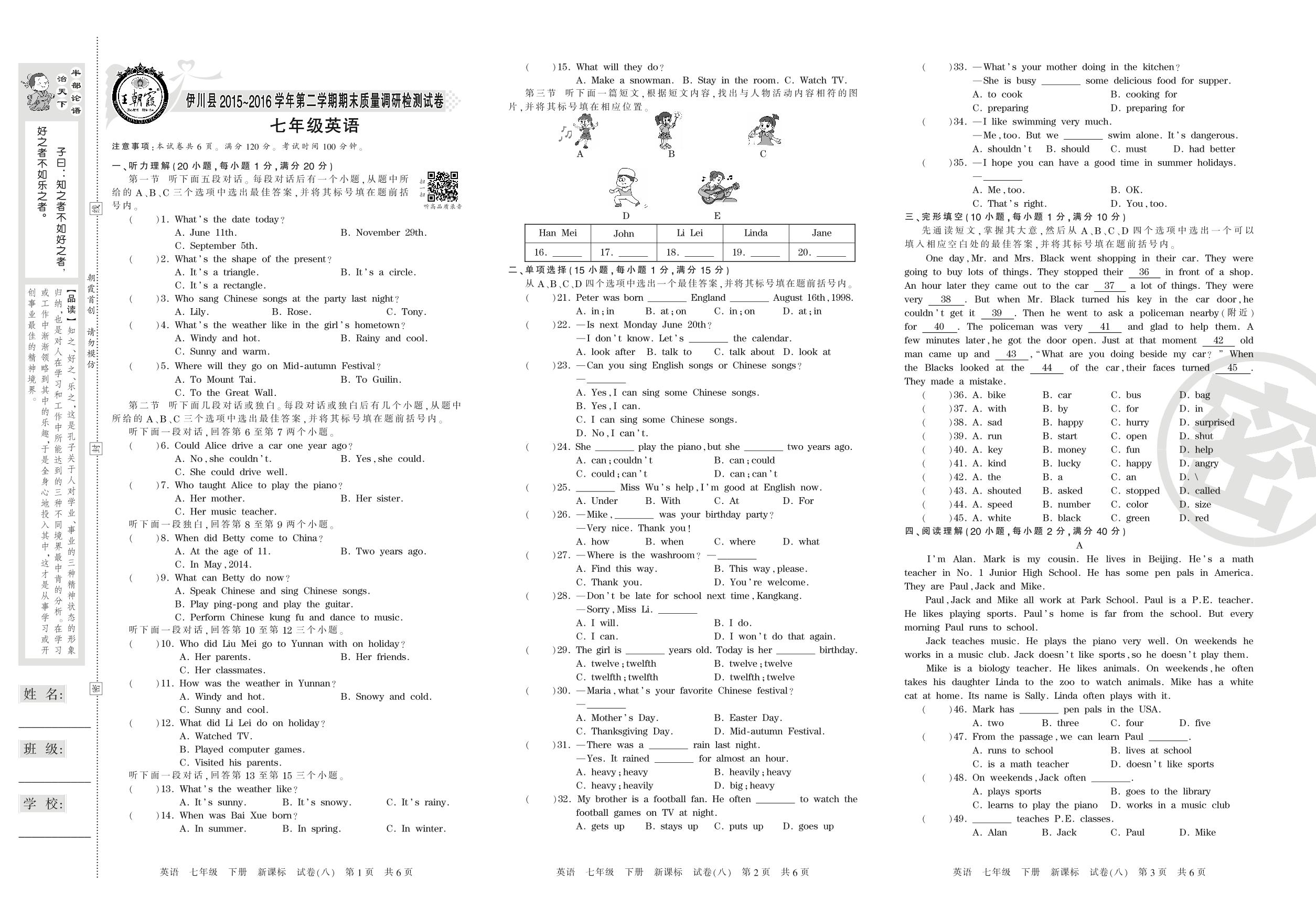 2015-2016学年第二学期洛阳市伊川县七年级英语试卷(新课版)【8】