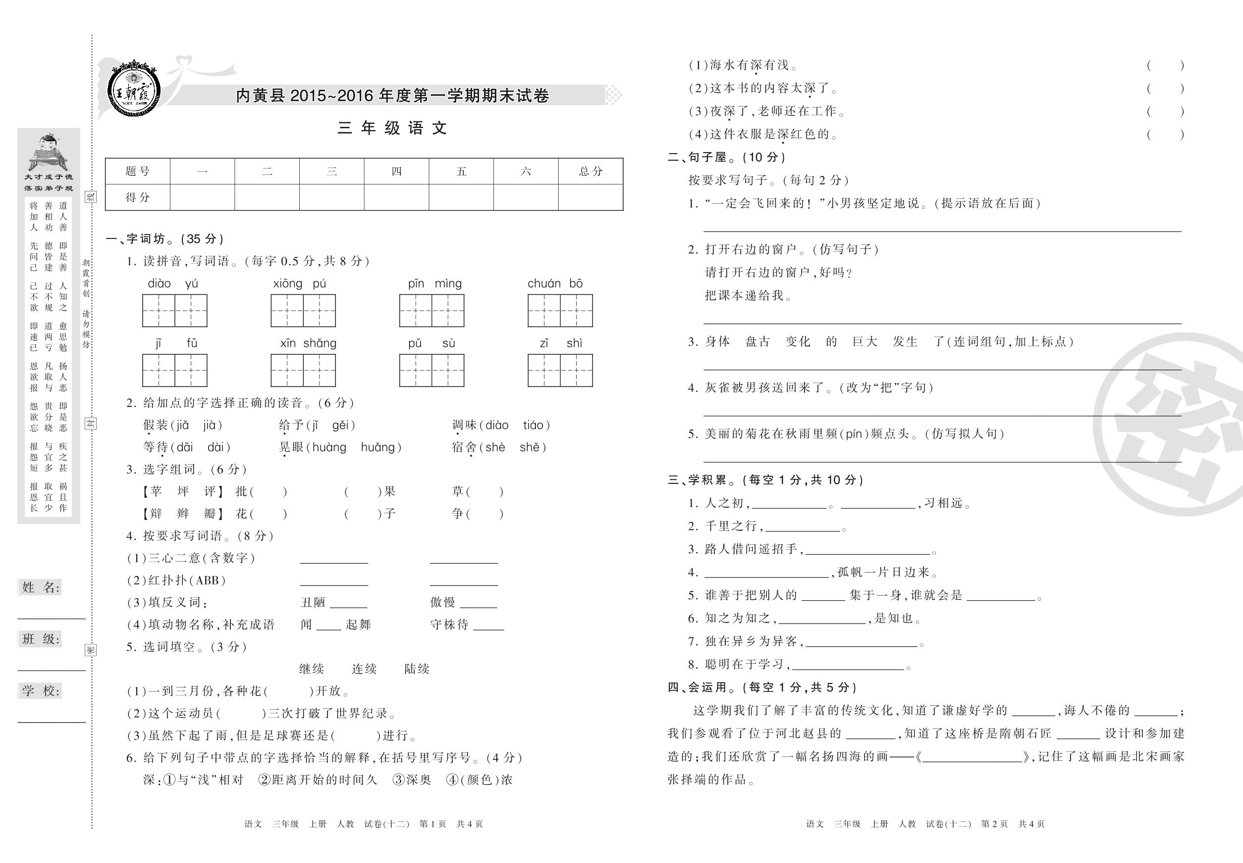 2015-2016学年第一学期安阳市内黄县三年级语文试卷(人教版)【12】