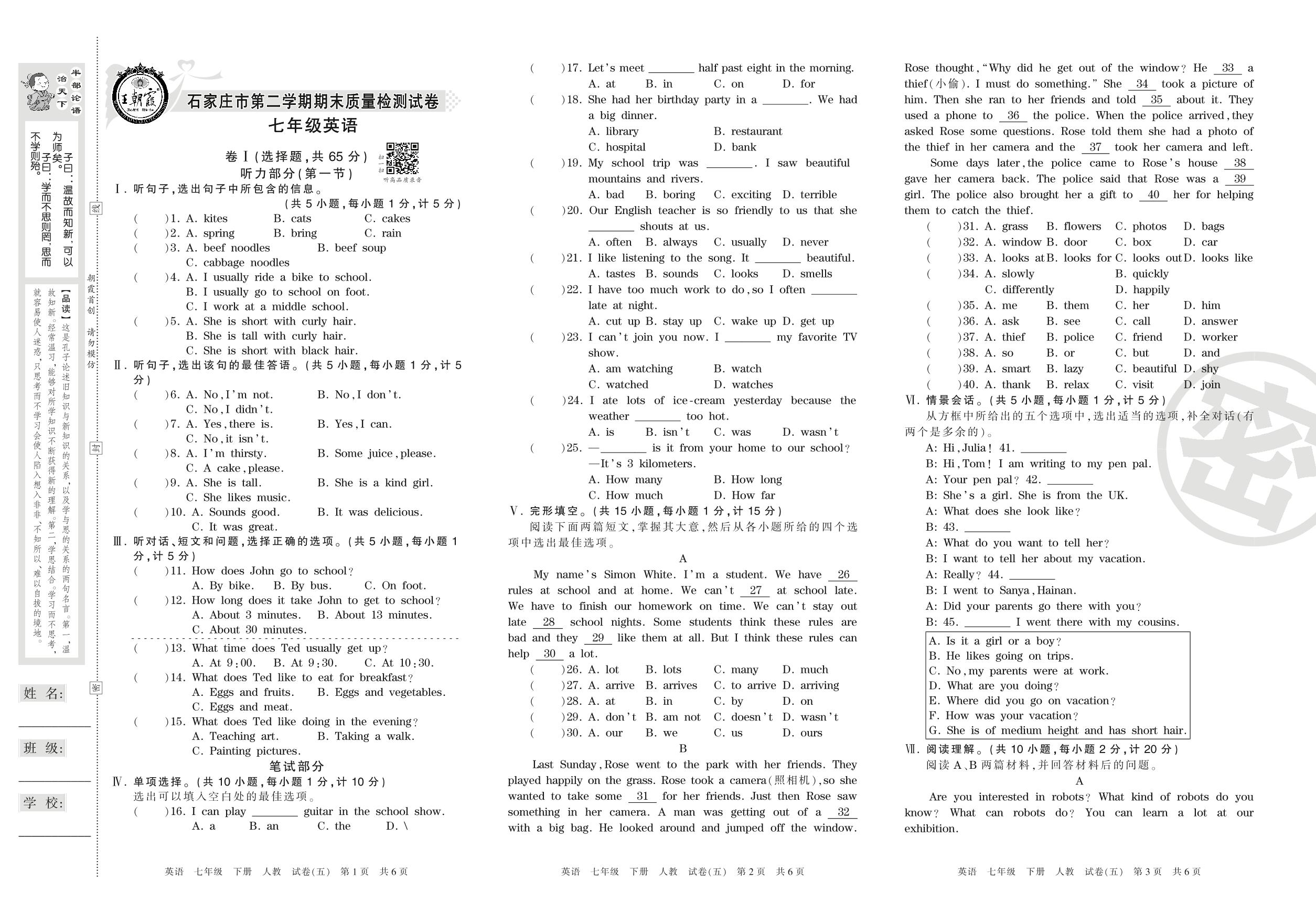 2015-2016学年第二学期石家庄市七年级英语试卷(人教版)【5】