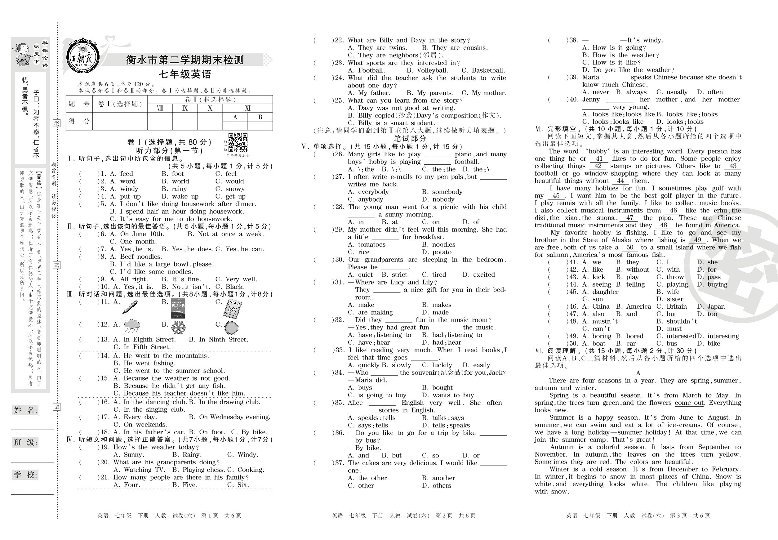 2015-2016学年第二学期衡水市七年级英语试卷(人教版)【6】