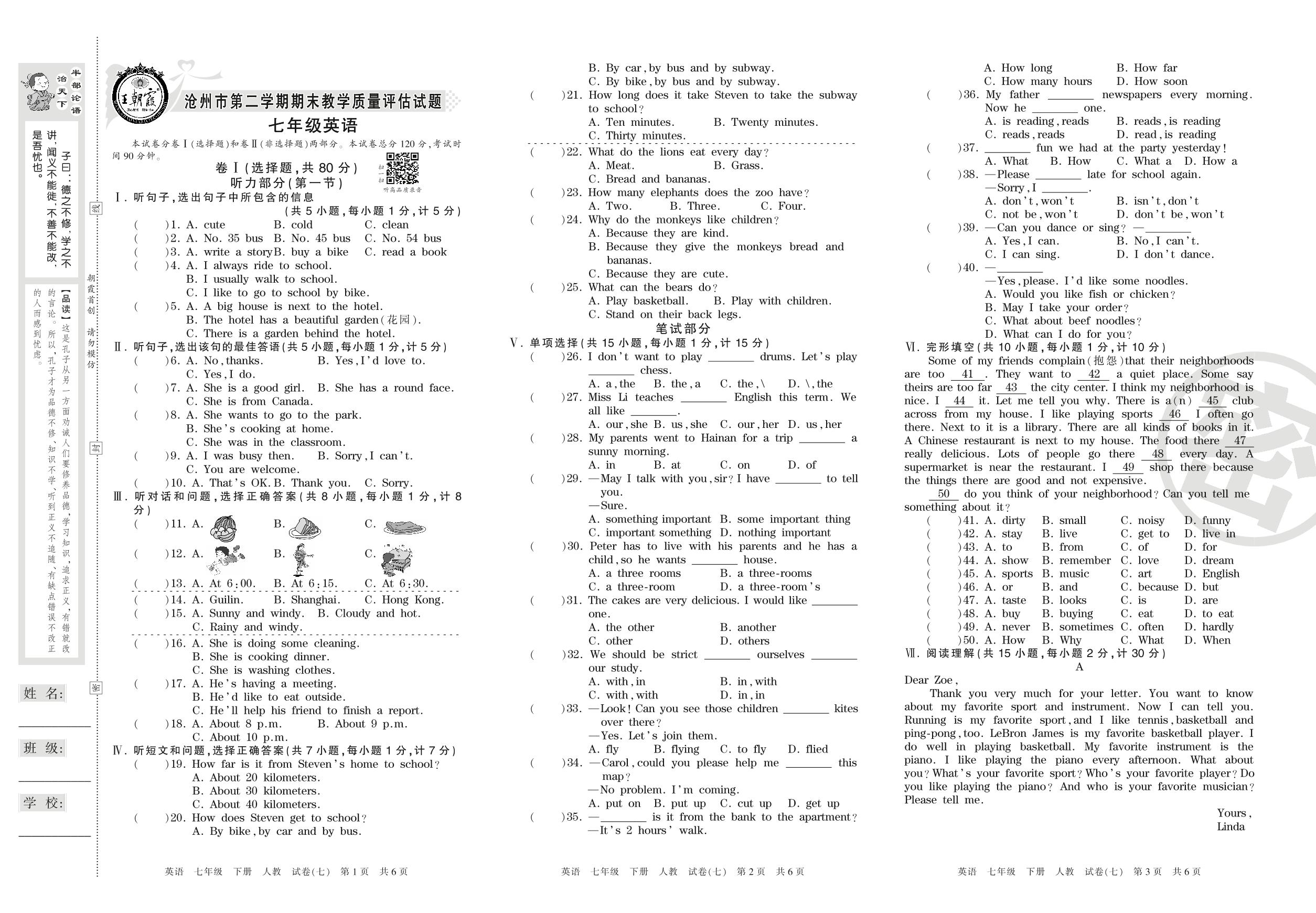 七年级英语人教版下册期末卷