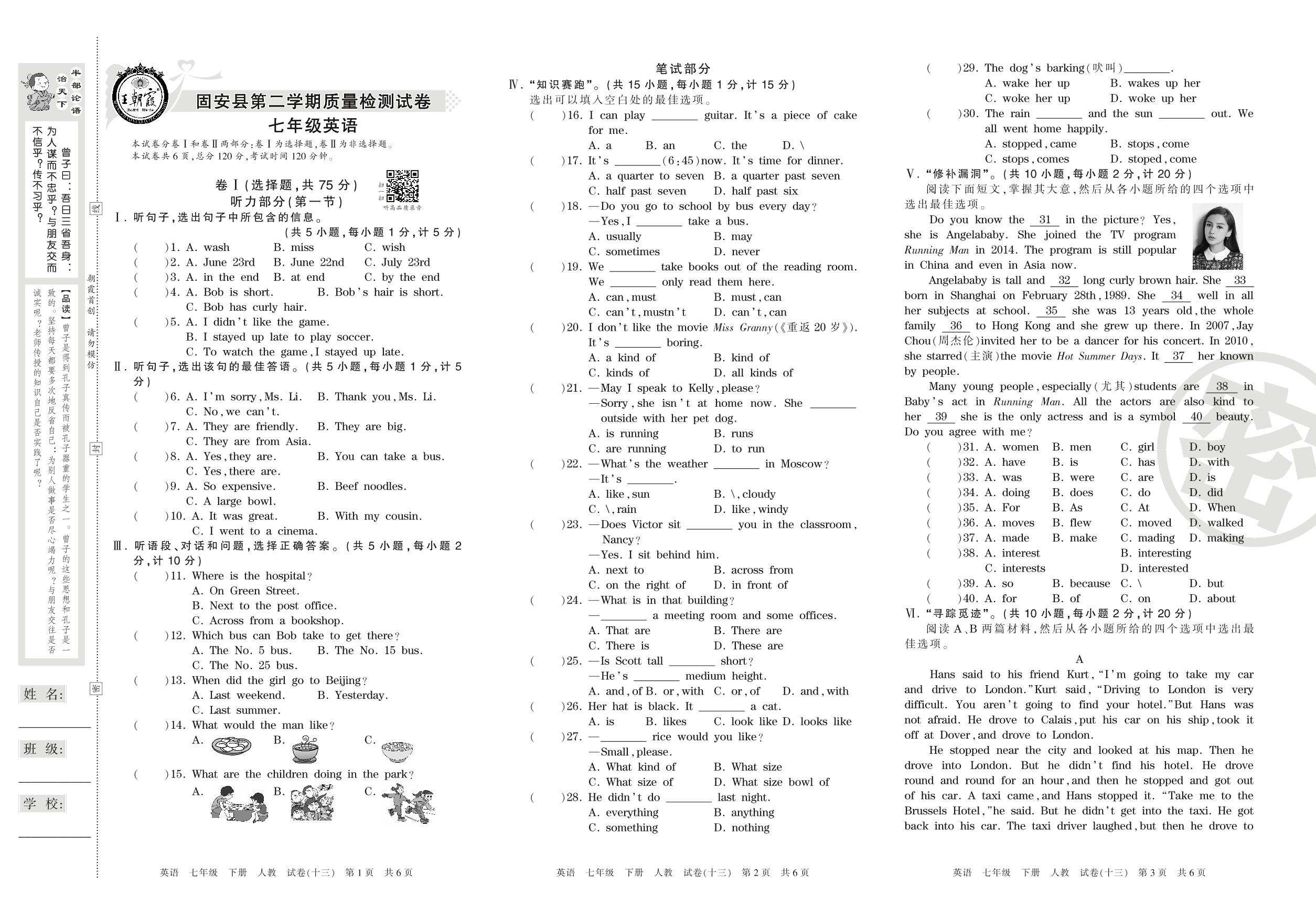 七年级英语人教版下册期末卷
