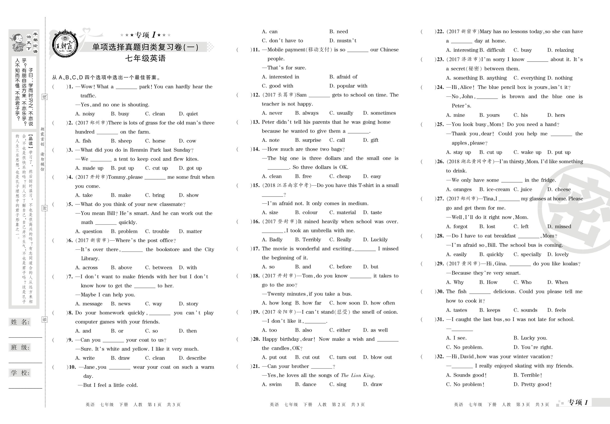 王朝霞期末专项卷——单项选择(一)(二)真题归类复习卷七年级下册英语(人教版)_R210807203920【0】