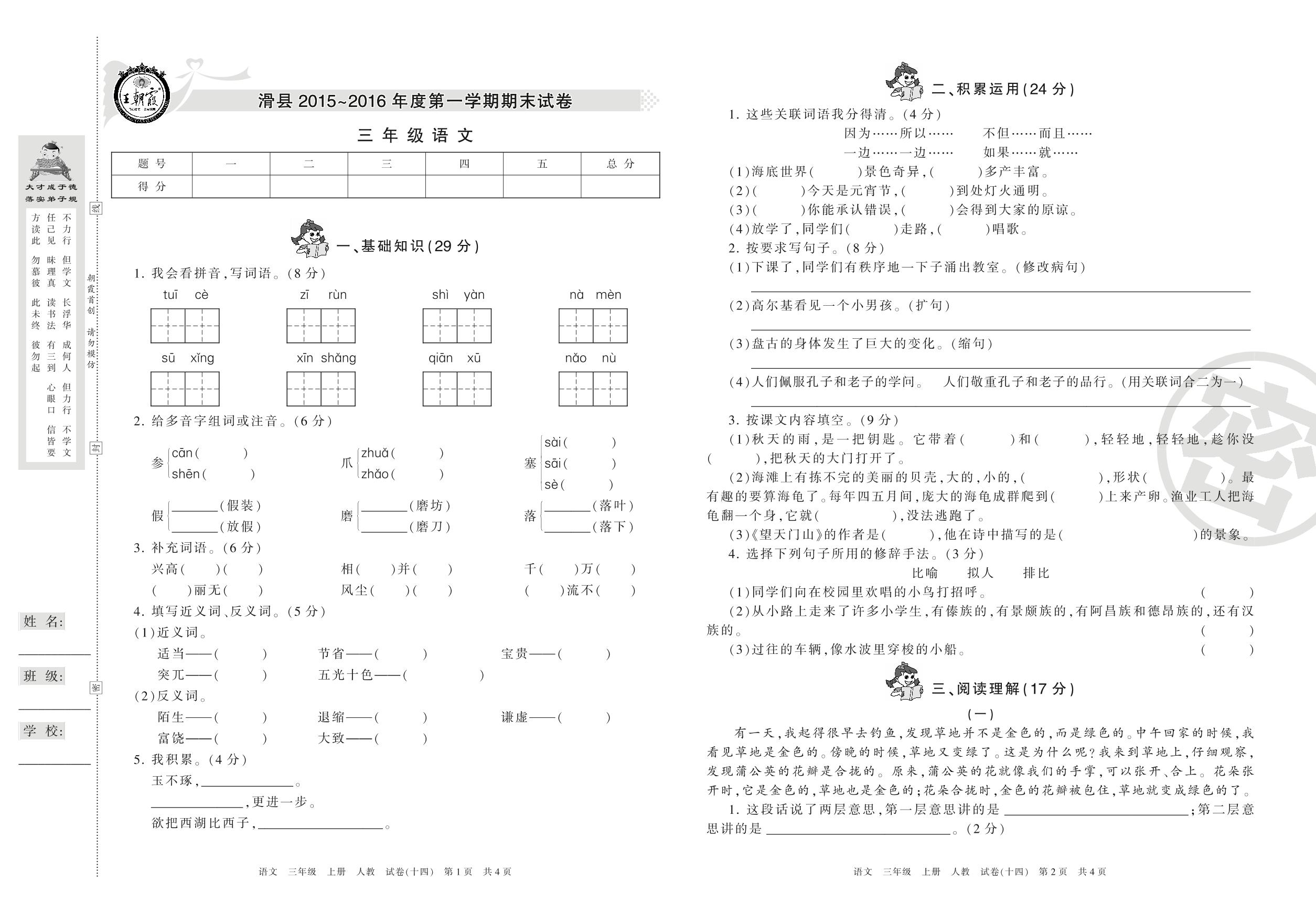 2015-2016学年第一学期安阳市滑县三年级语文试卷(人教版)【14】