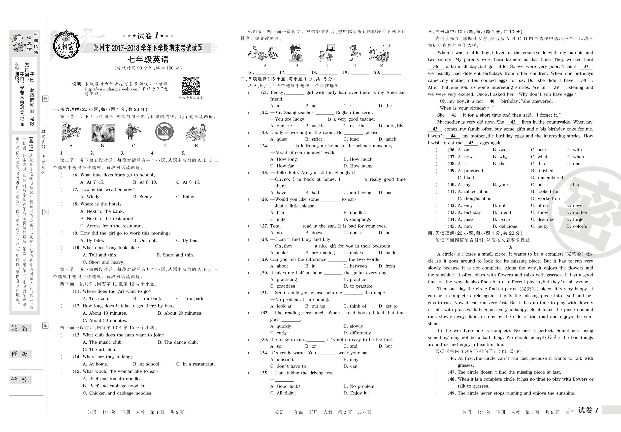 2017-2018学年第二学期郑州市七年级英语试卷(人教版)_R210807203947【1】
