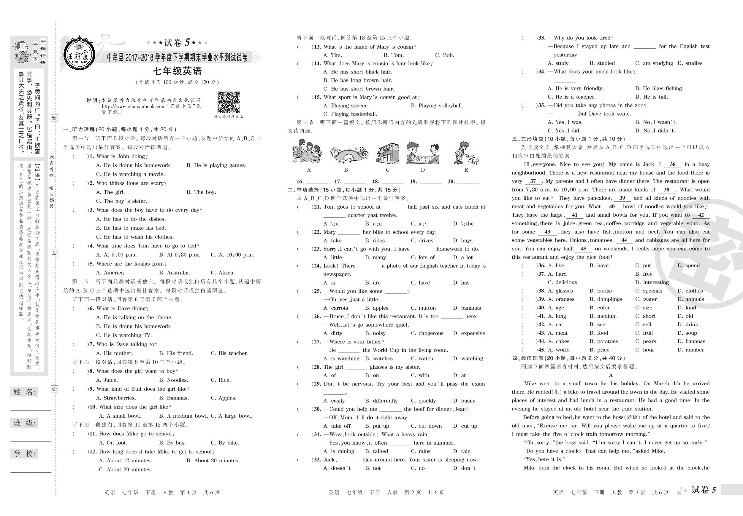 2017-2018学年第二学期郑州市中牟县七年级英语试卷(人教版)【5】