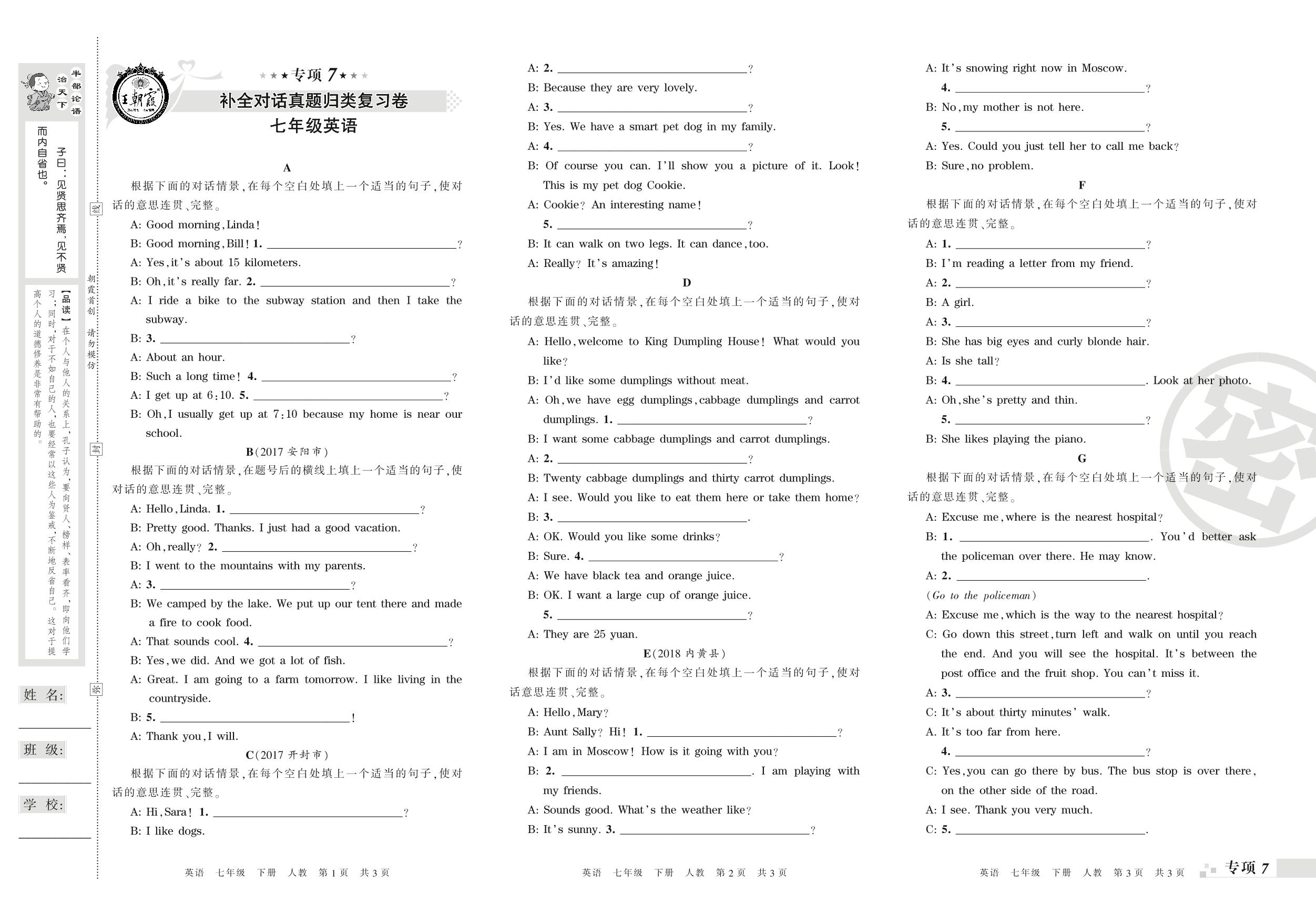 王朝霞期末专项卷——补全对话、书面表达真题归类复习卷七年级下册英语(人教版)_R210807204123【0】