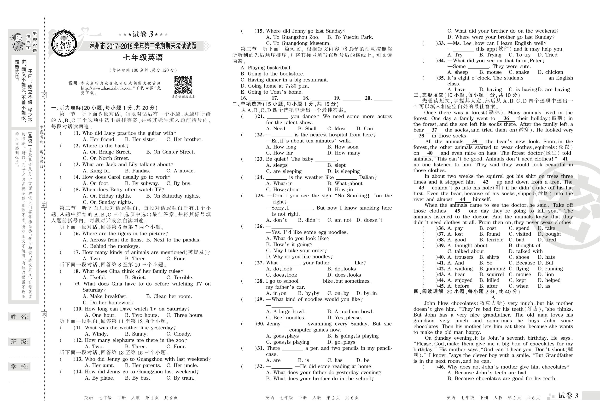 2017-2018学年第二学期林州市七年级英语试卷(人教版)【3】